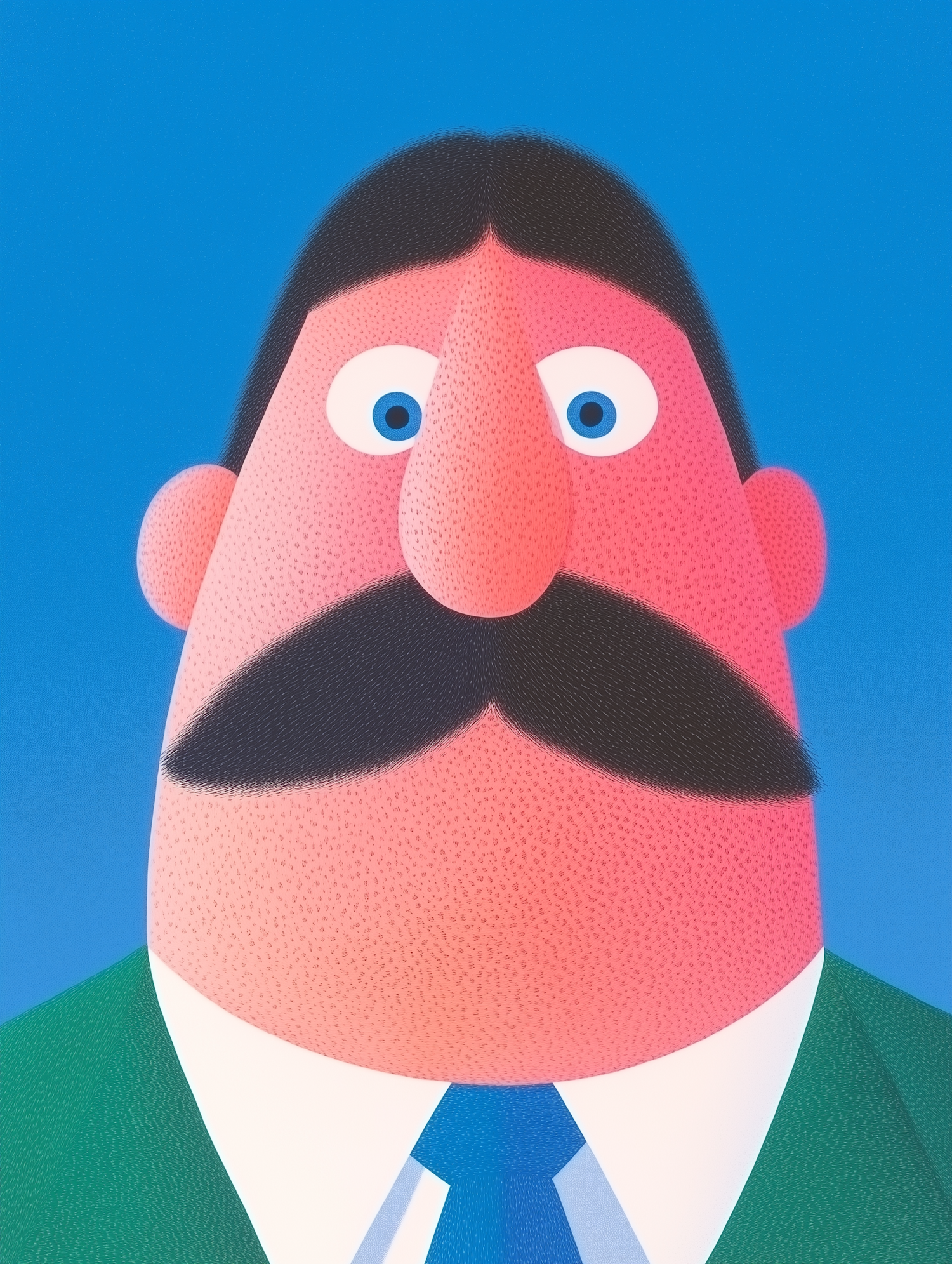 Bright cartoon illustration of a man with a pink face, black mustache, and blue tie against a vibrant blue background.