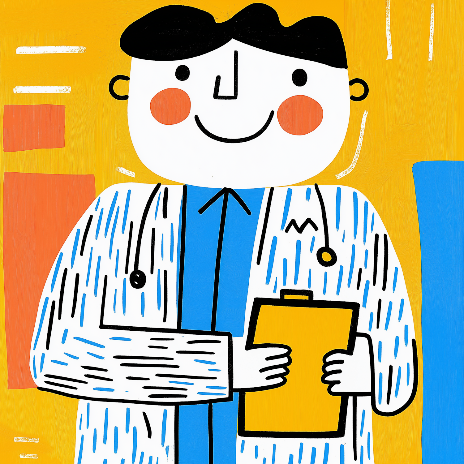 Cheerful cartoon doctor with a stethoscope and clipboard on a vibrant yellow background.