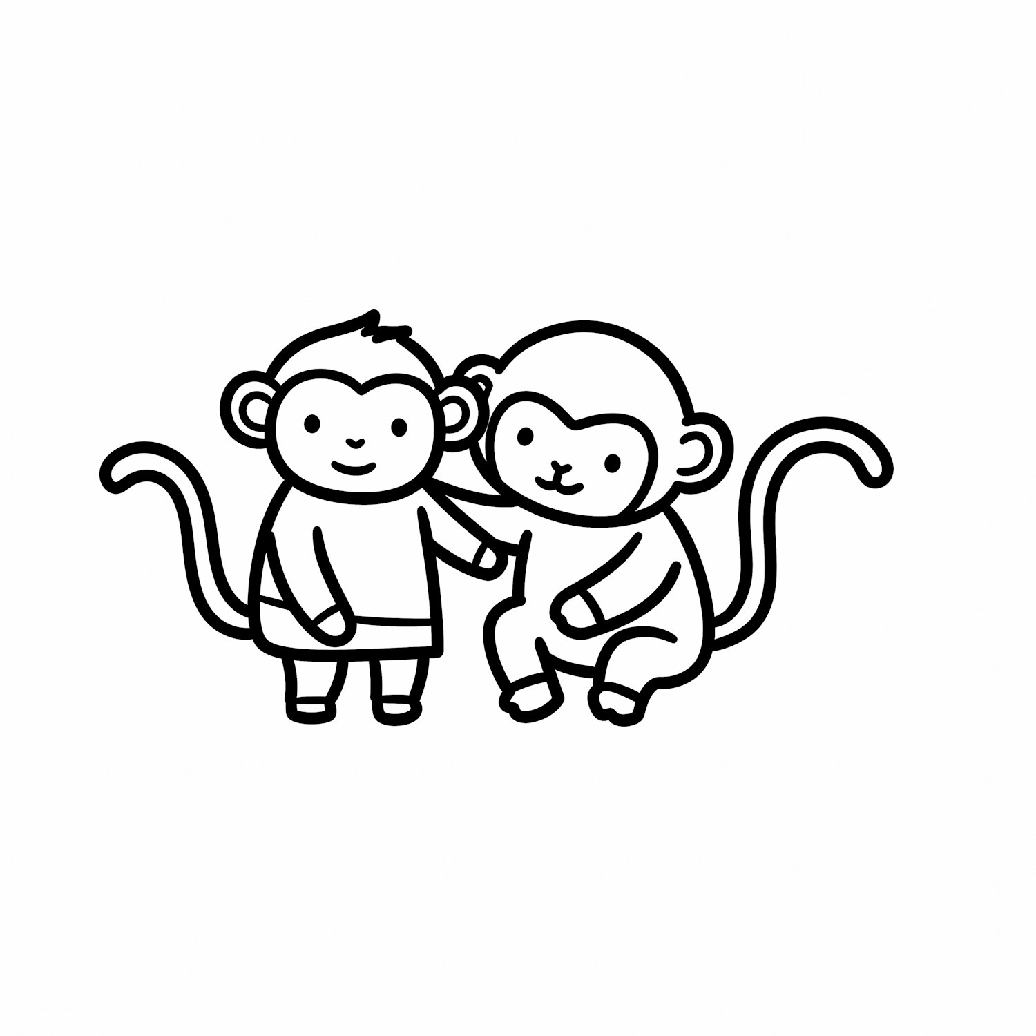 A cute black-and-white line drawing of two cartoon monkeys sitting together, showcasing a friendly and cheerful vibe.