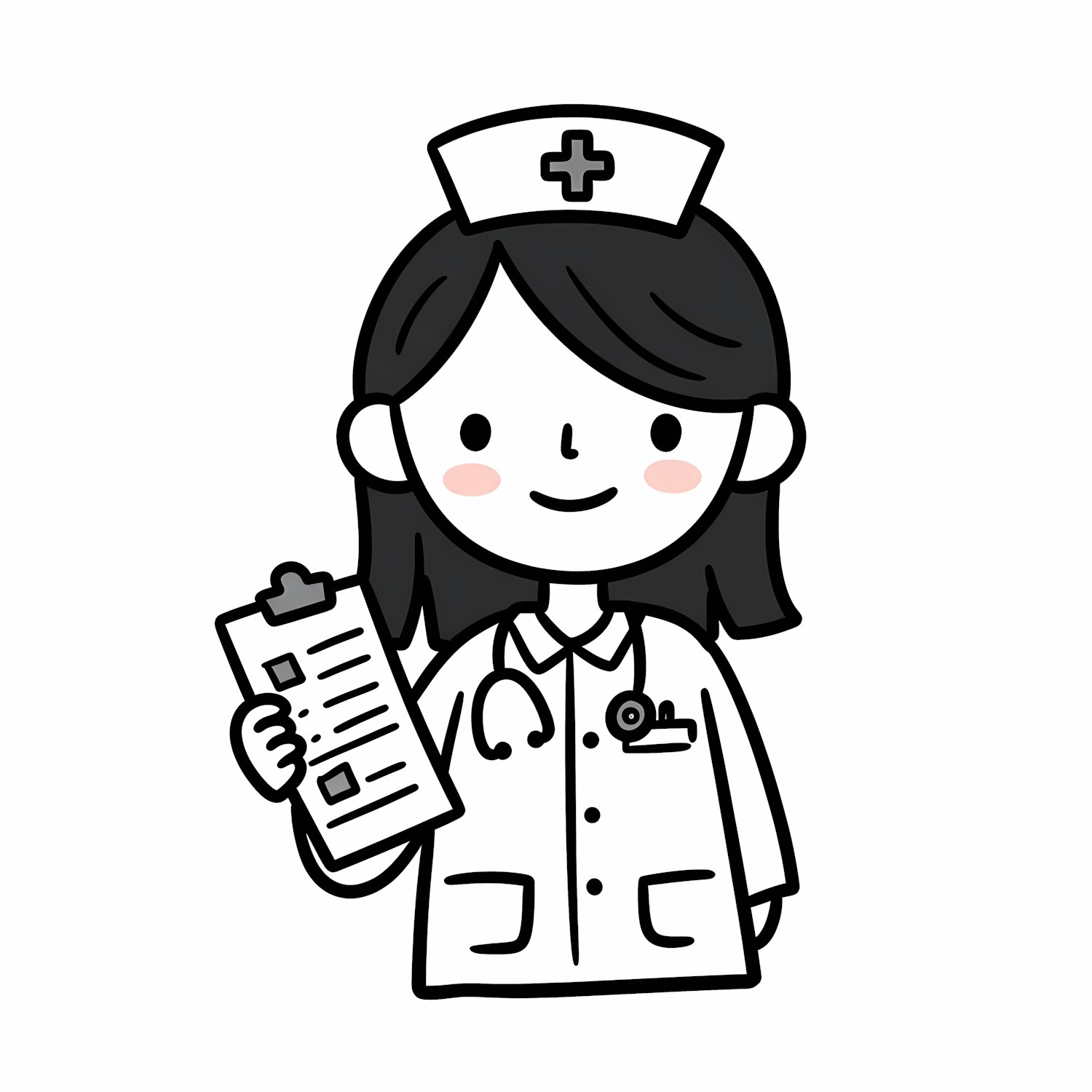 Cartoon illustration of a nurse holding a clipboard, wearing a white uniform and cap, with a stethoscope around her neck.