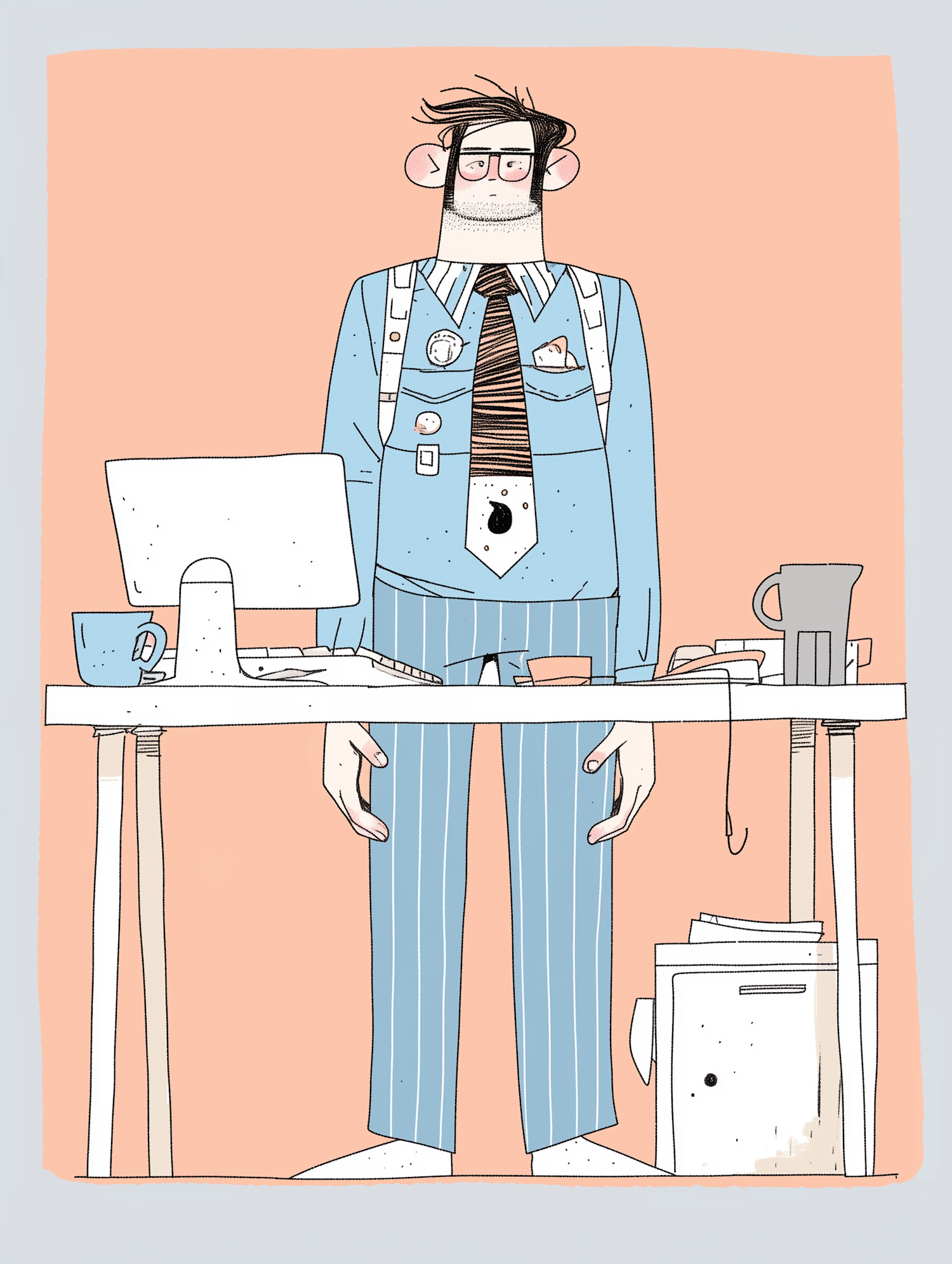 Whimsical cartoon of a man in a blue pinstripe suit at a desk with a computer and coffee mug, set against a peach background.