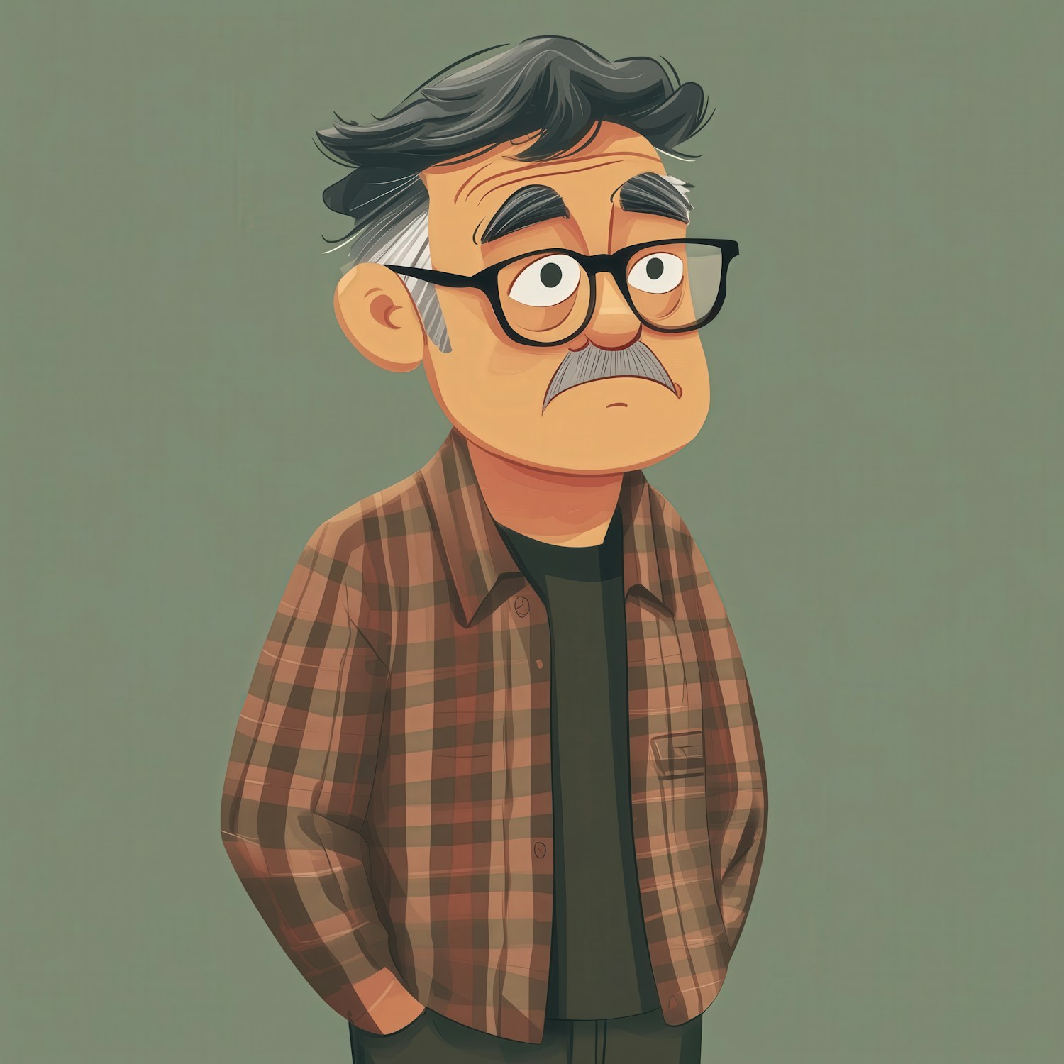 Cartoon illustration of an older man with glasses, a mustache, and a plaid shirt, looking thoughtful against a muted green background.