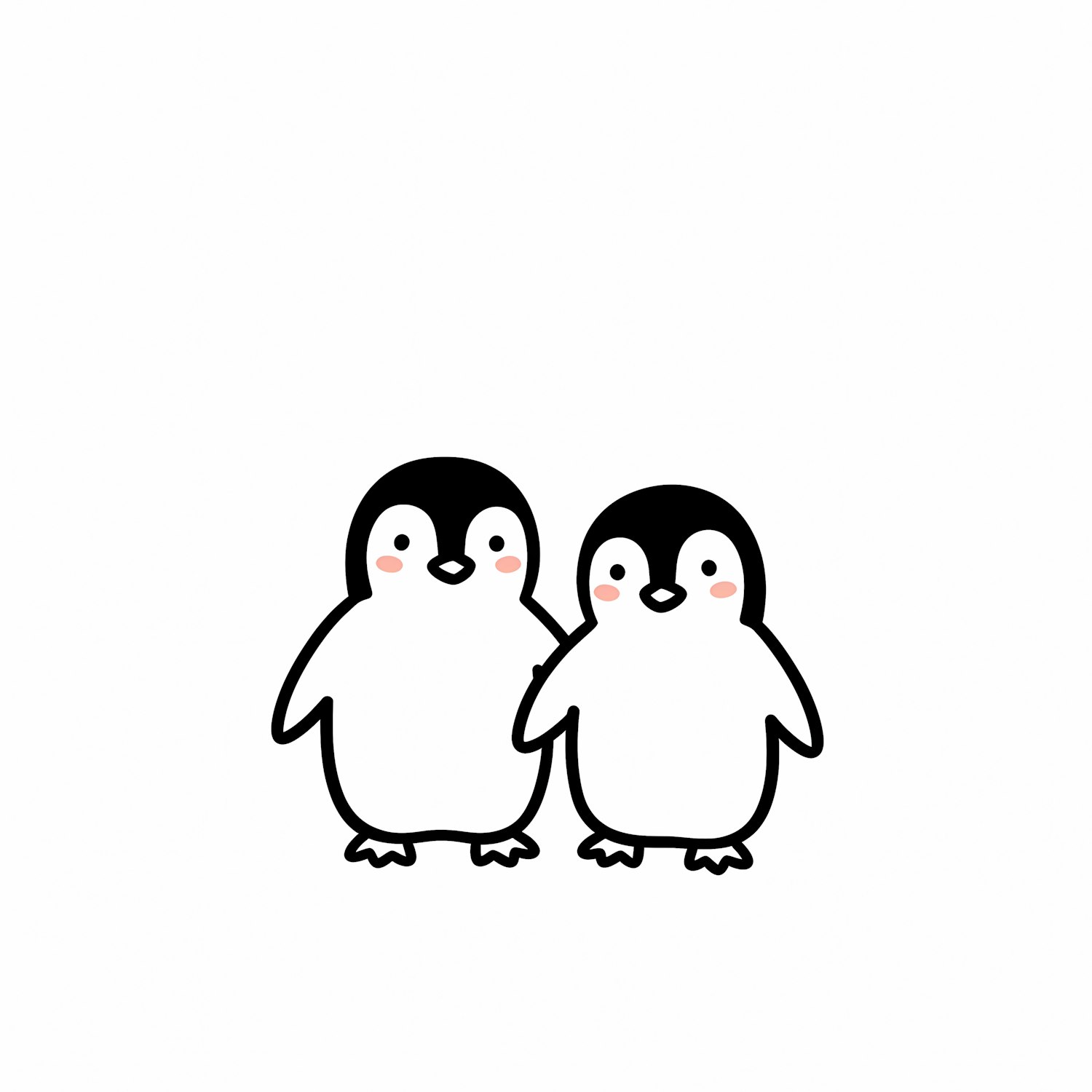 Two cute cartoon penguins with rosy cheeks stand together on a white background, showcasing a simple and charming design.