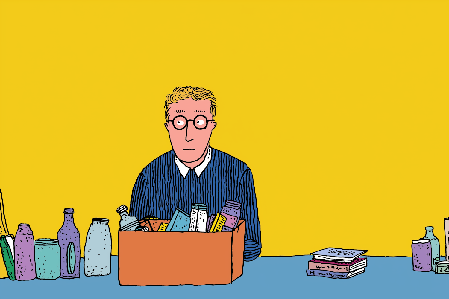 Cartoon illustration of a person with glasses and a box of colorful bottles on a table, set against a bright yellow background.