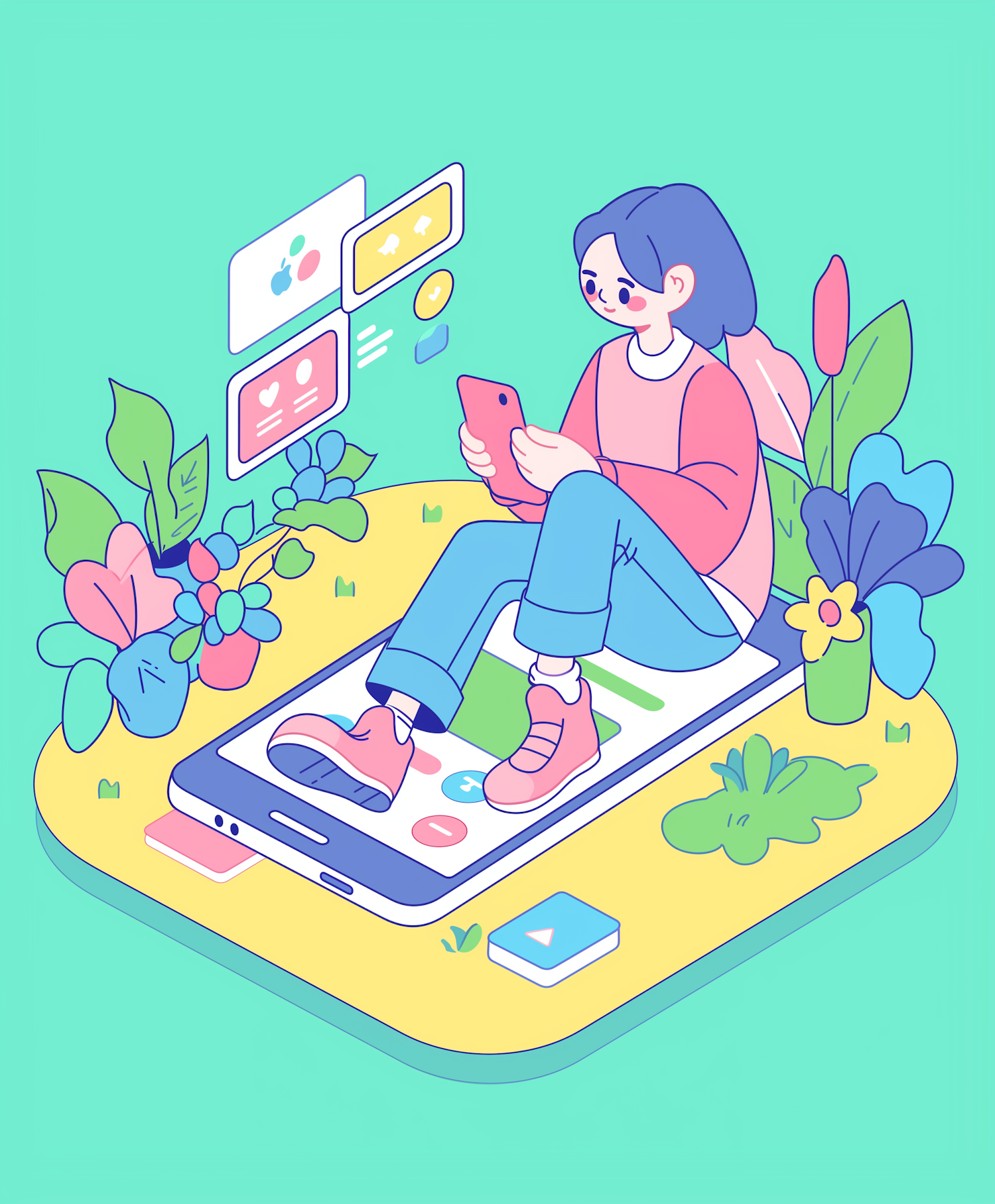 Vibrant illustration of a person interacting with a smartphone, surrounded by plants and floating app icons on a teal background.