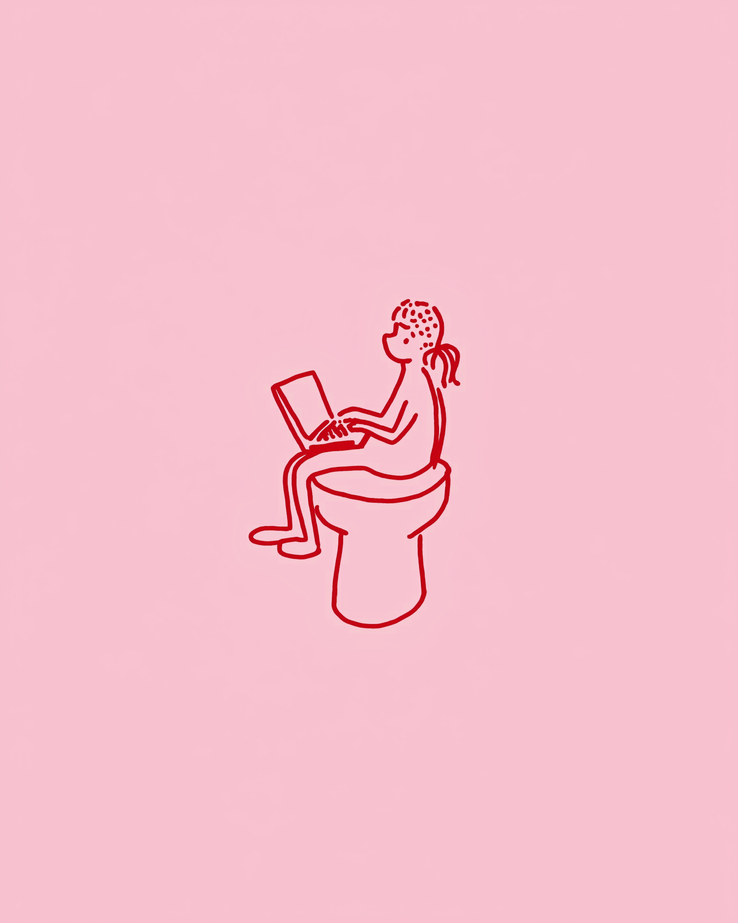 Humorous illustration of a person using a laptop on a toilet, drawn in red on a pink background, highlighting modern multitasking habits.