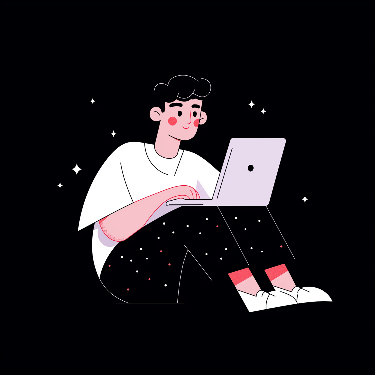 Cartoon illustration of a person using a laptop, sitting cross-legged with a cosmic-themed background. Light skin, black hair, white t-shirt.