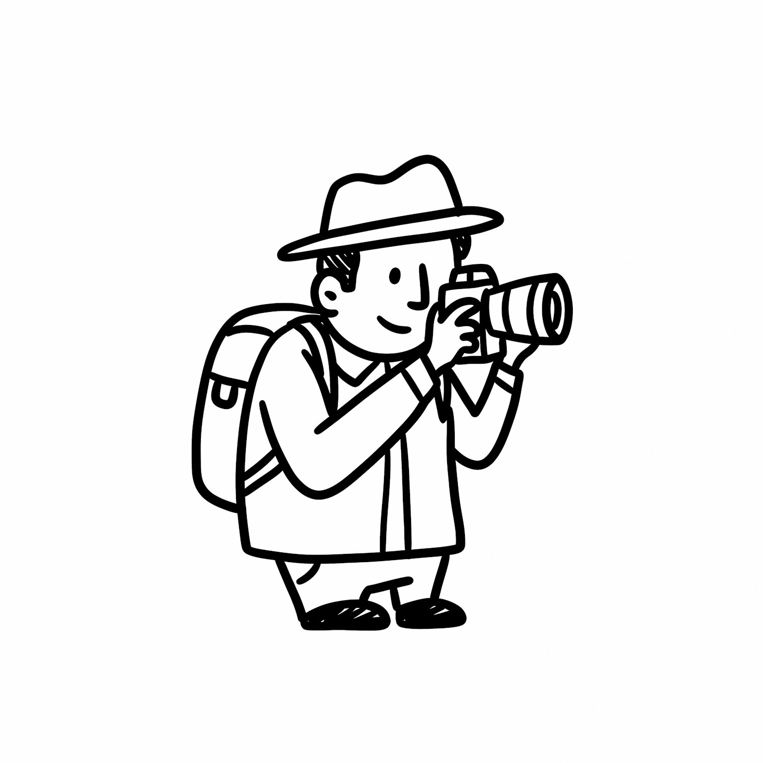 Cartoon illustration of a traveler with a camera and backpack, crouching to take a photo. Simple black-and-white design with bold outlines.