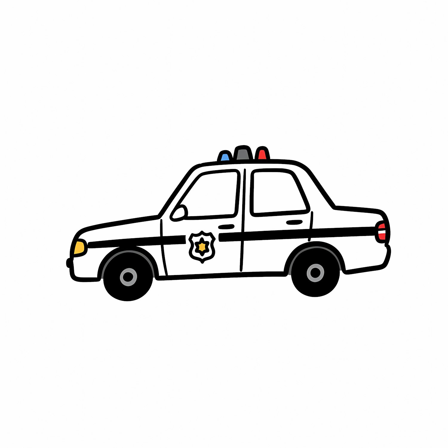 Cartoon-style illustration of a white police car with a light bar and badge emblem, drawn in a simple and clean design.