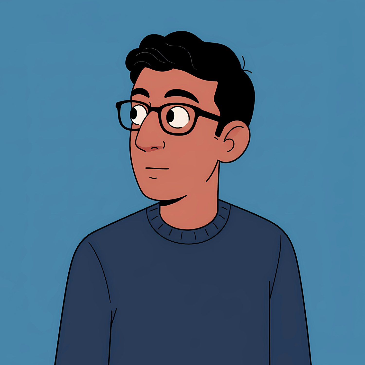 Cartoon illustration of a person with glasses and a blue sweater, looking to the side, on a simple blue background.
