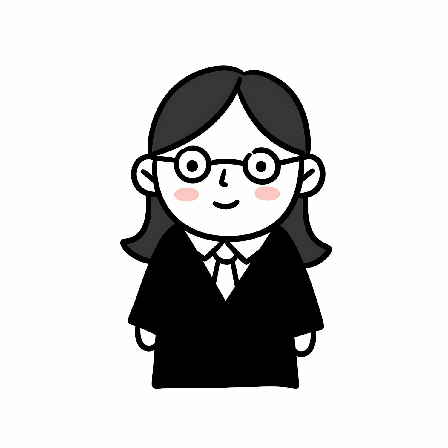 Cartoon illustration of a professional individual with glasses, dark hair, and a formal suit, set against a clean white background.
