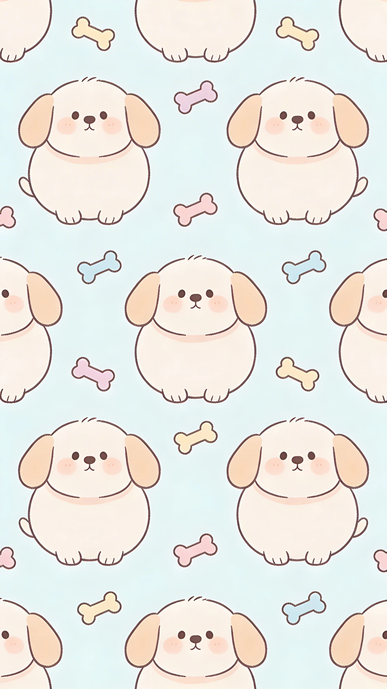Repeating pattern Round puppies with floppy ears, pastel bones scattered around.