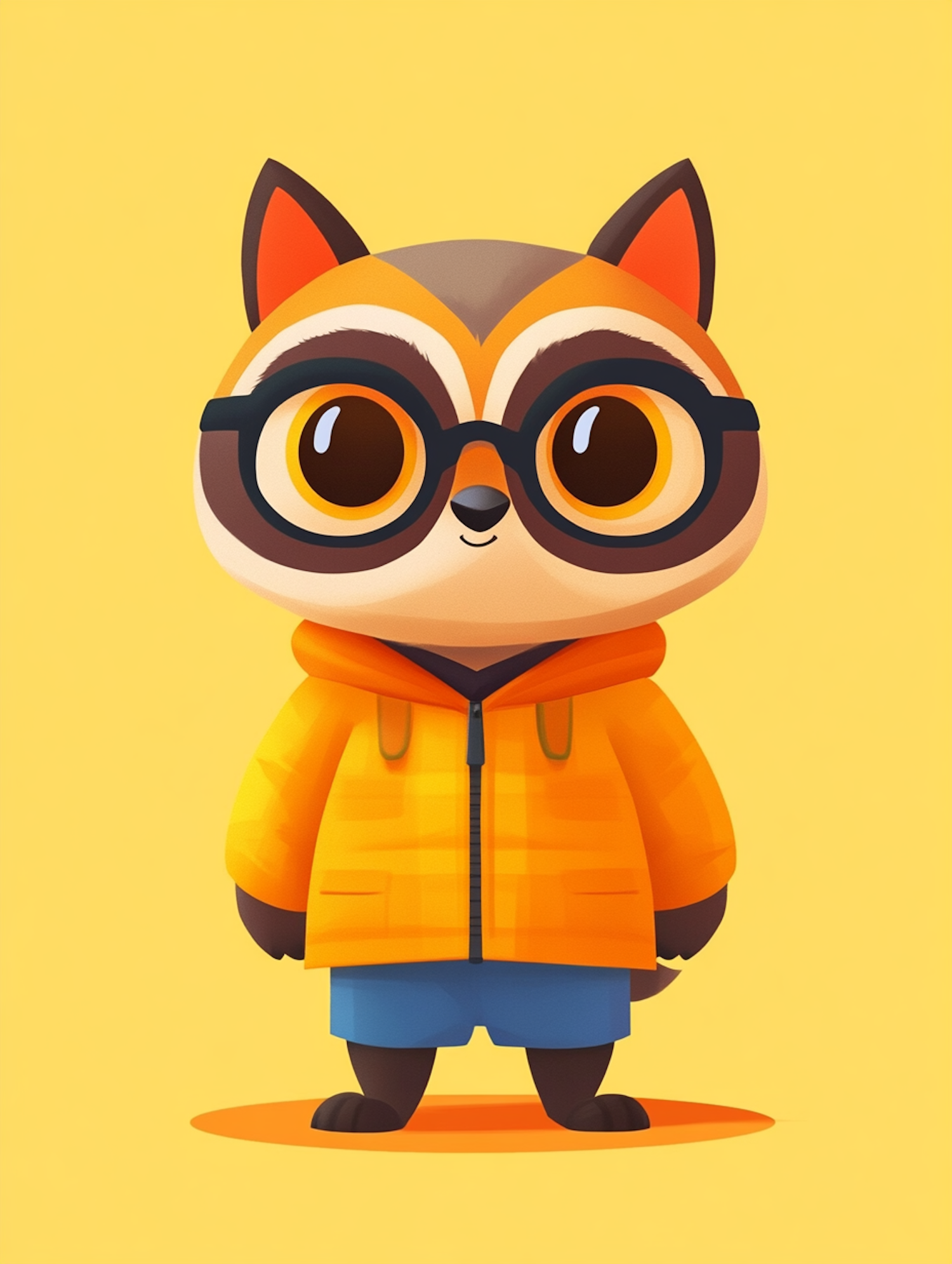Adorable cartoon raccoon with glasses, orange jacket, and blue shorts on a bright yellow background. Cute and whimsical design.