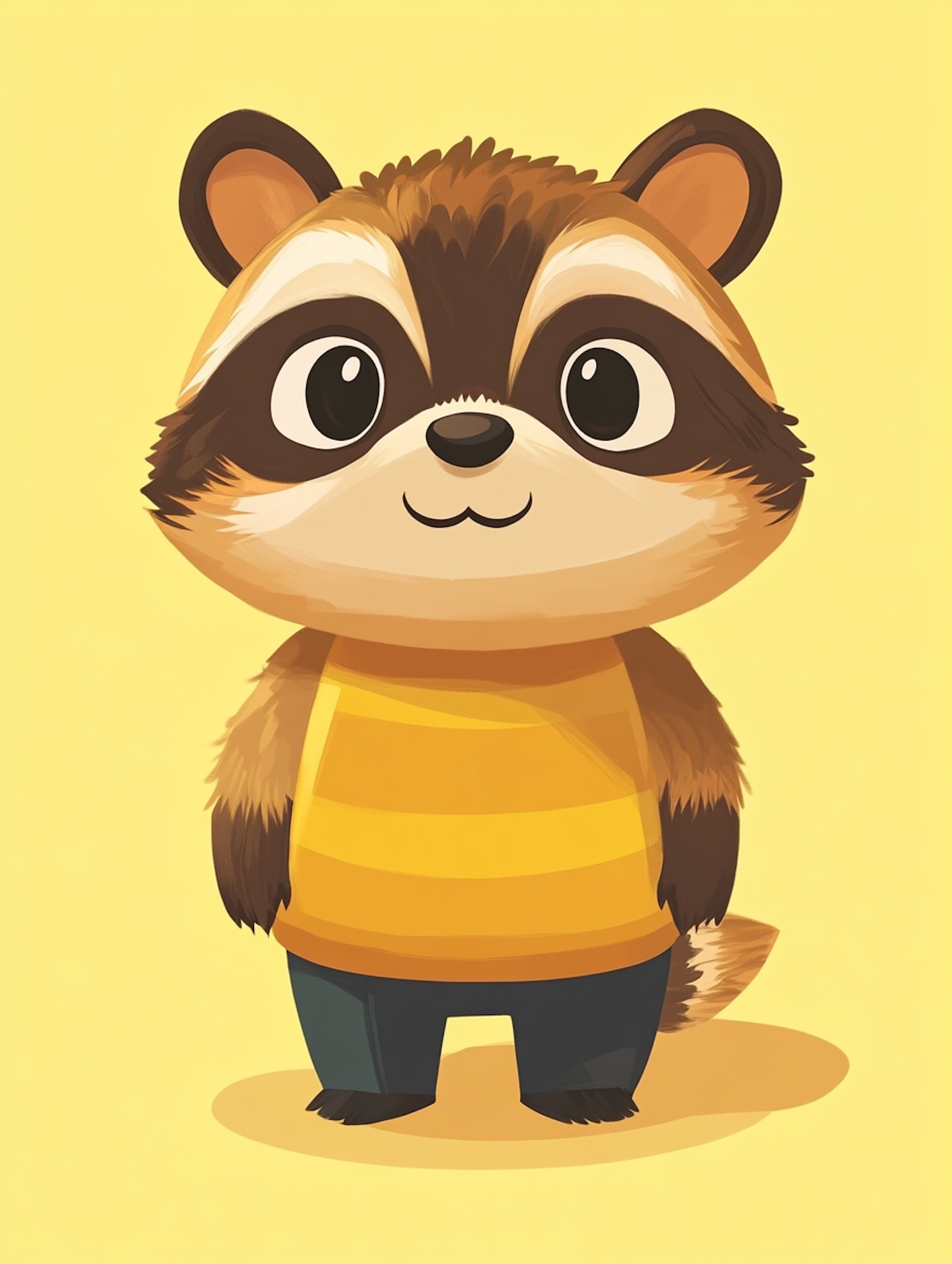 Adorable cartoon raccoon with big eyes, wearing a striped shirt and pants, set against a bright yellow background.