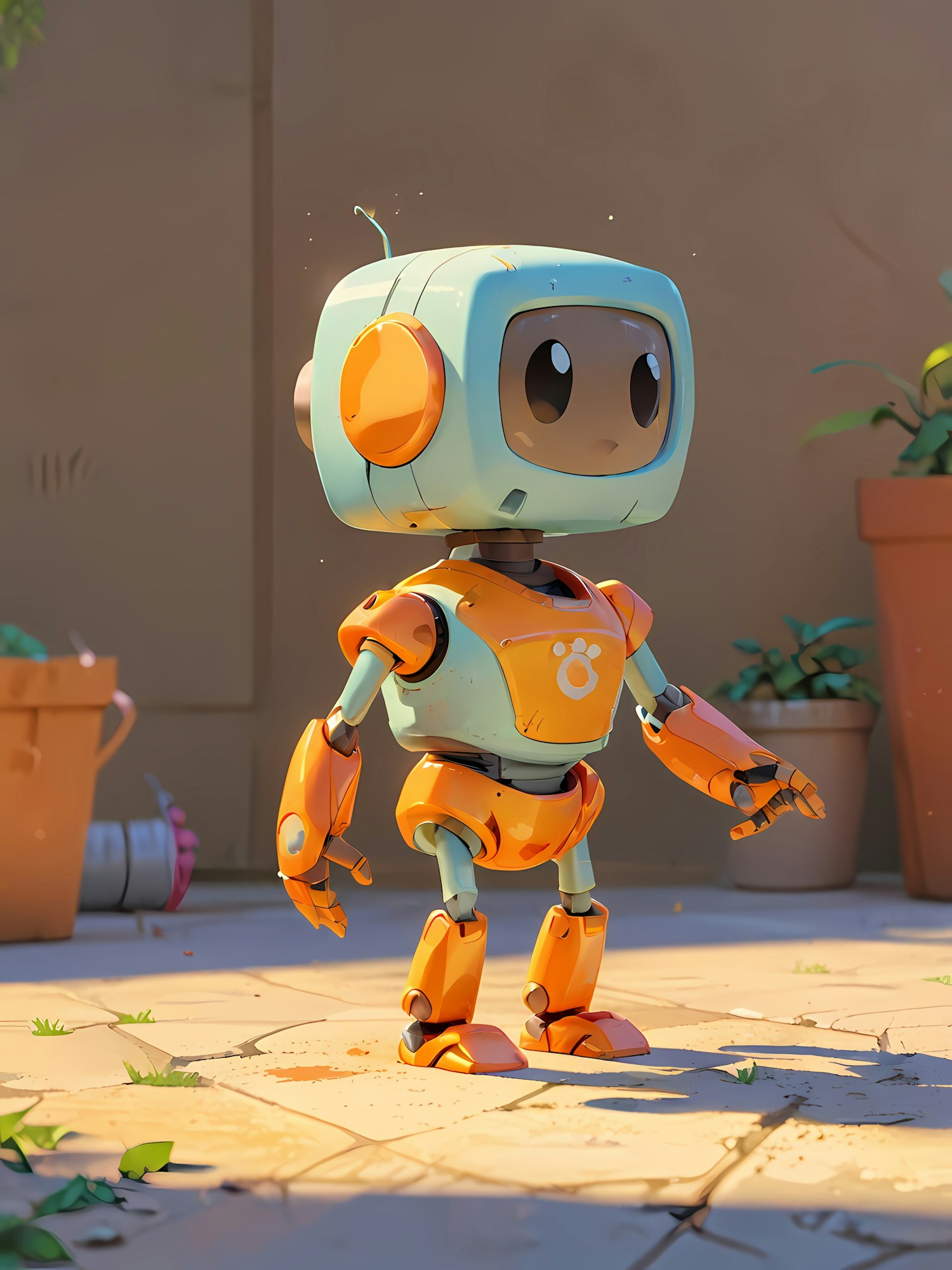 Adorable cartoon robot with teal and orange design in a sunny garden setting, surrounded by potted plants and cracked stone pavement.