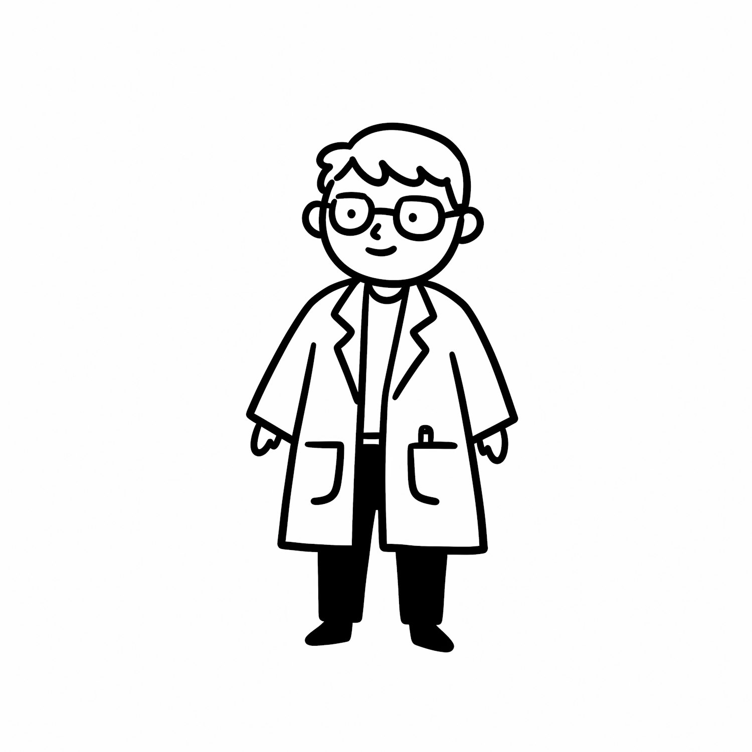 Cartoon illustration of a scientist in a lab coat with glasses and a friendly expression, drawn in a clean black-and-white style.