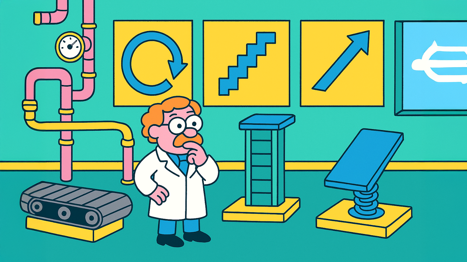 Cartoon scientist in a lab with pipes, conveyor belt, and diagrams, pondering mechanical designs in a colorful, playful setting.