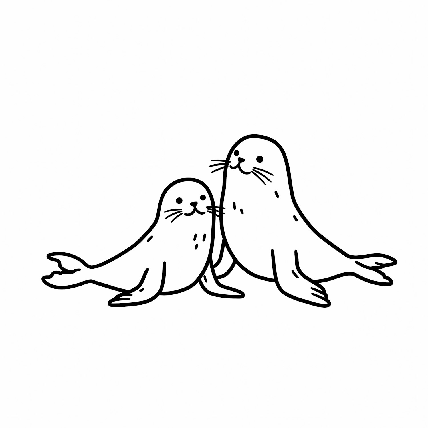 Adorable black-and-white line art of two seals, one larger and one smaller, sitting together with cheerful expressions.