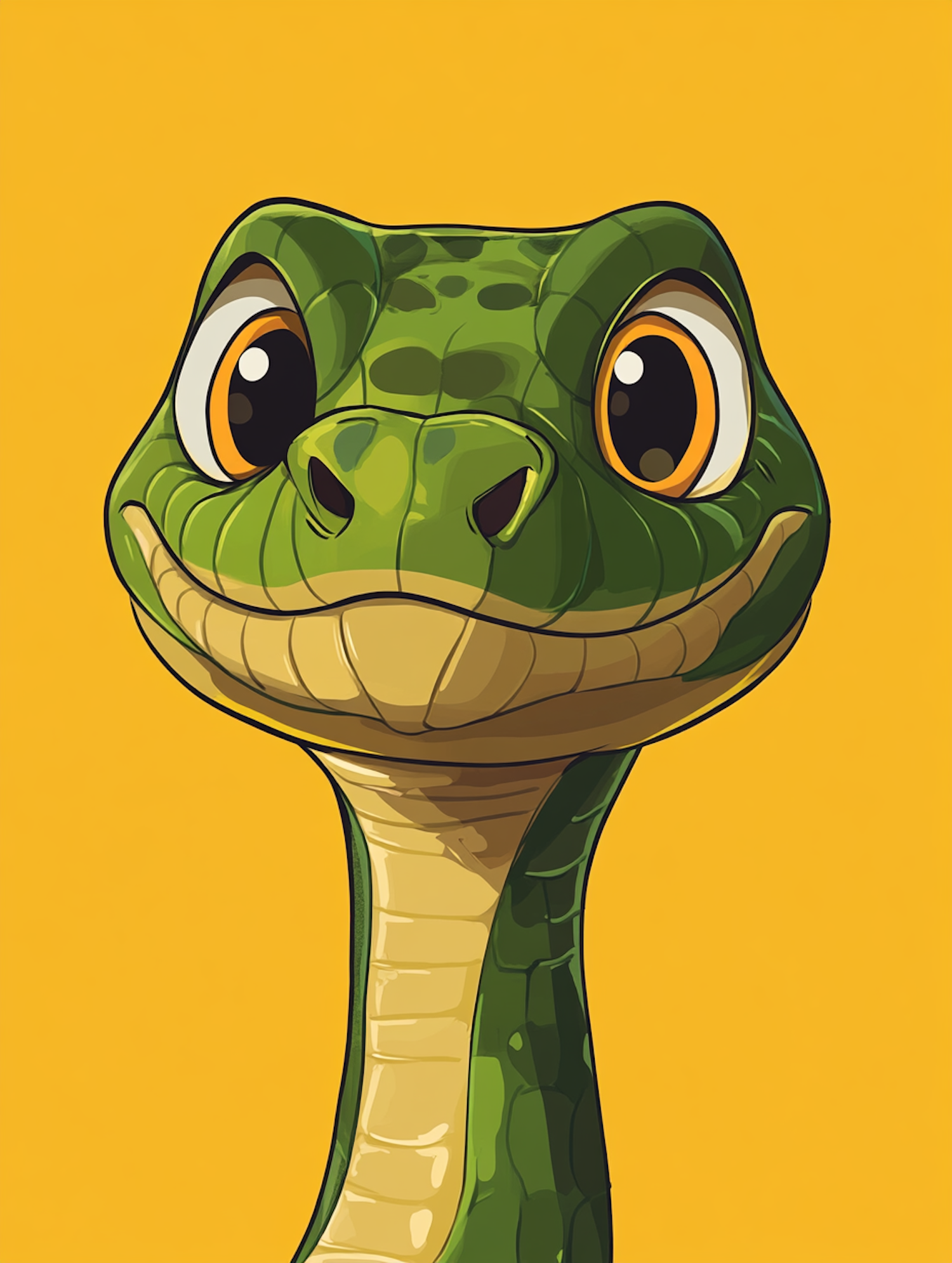Cartoon snake with green scales and big orange eyes on a bright yellow background, exuding a friendly and playful vibe.