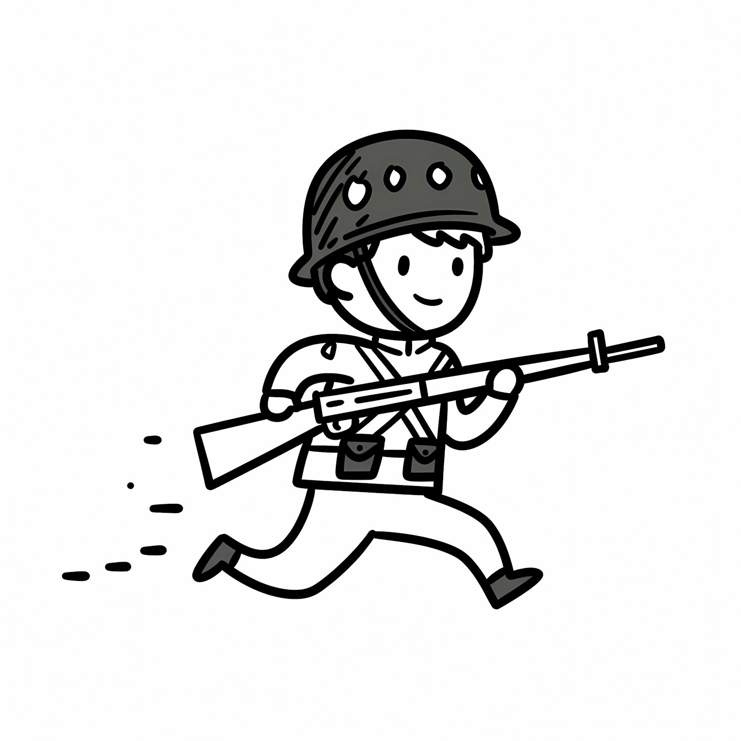 Cartoon soldier illustration in black and white, running with a rifle, wearing a helmet and uniform, in a simple and playful style.