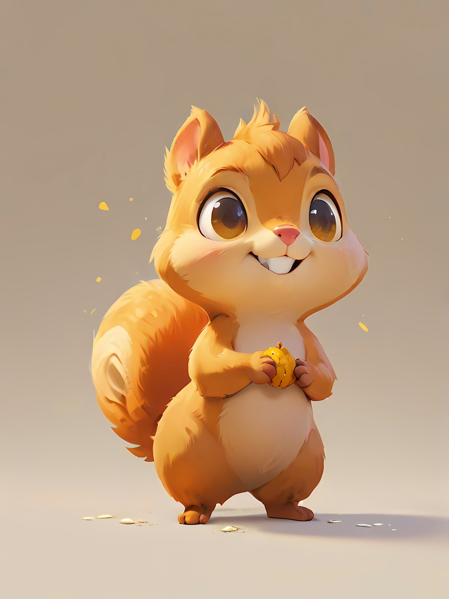 Adorable cartoon squirrel with big eyes and fluffy fur holding an acorn, set against a neutral background. Perfect for kids' content!