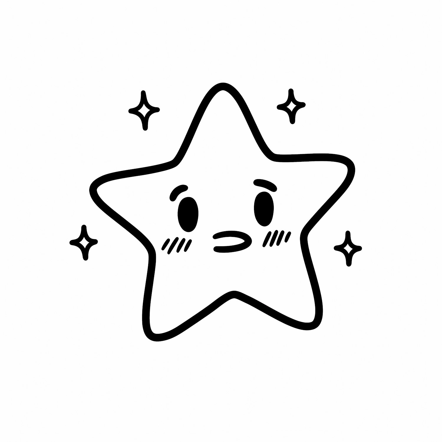 A cute black-and-white cartoon star with a shy expression, surrounded by sparkles, perfect for whimsical and fun designs.