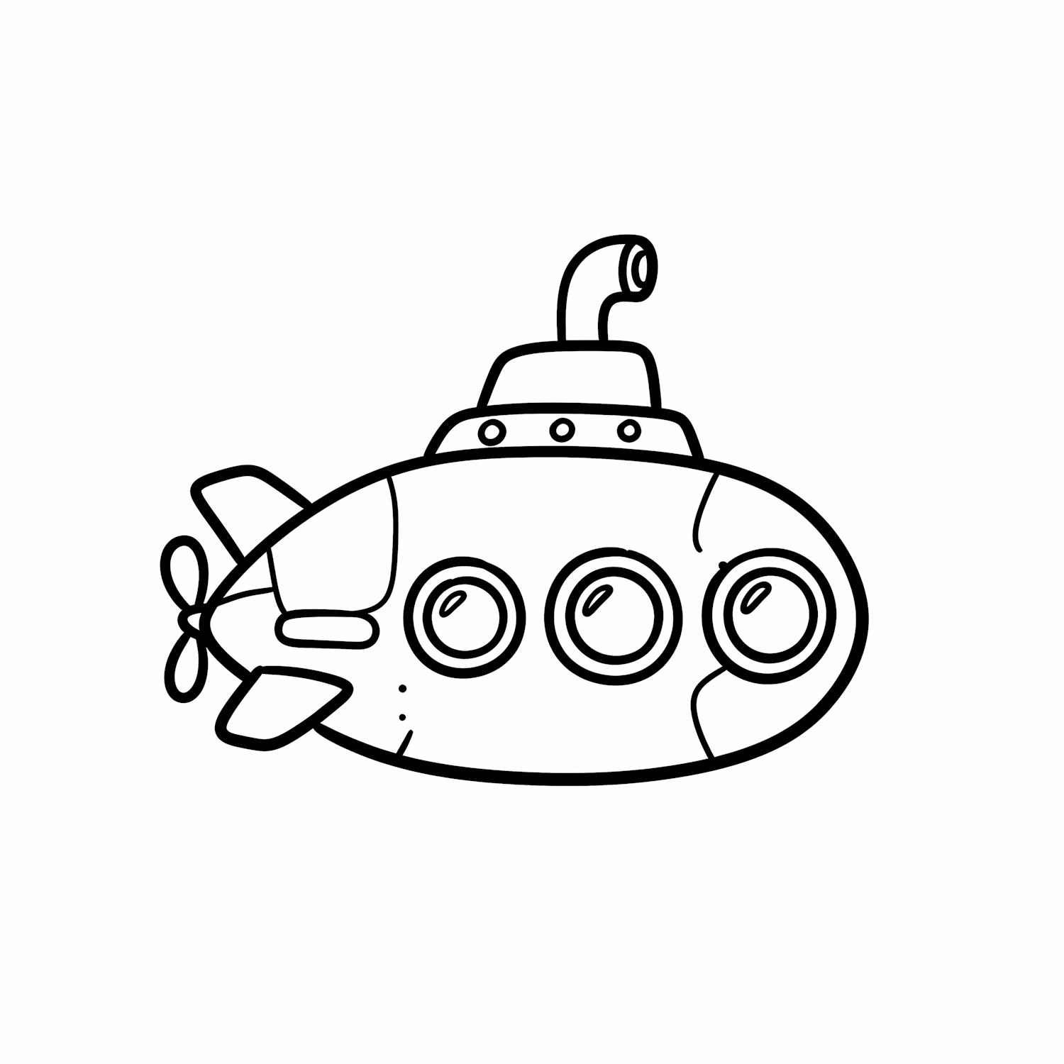 A black-and-white cartoon-style submarine illustration with three windows and a periscope, perfect for coloring or educational materials.