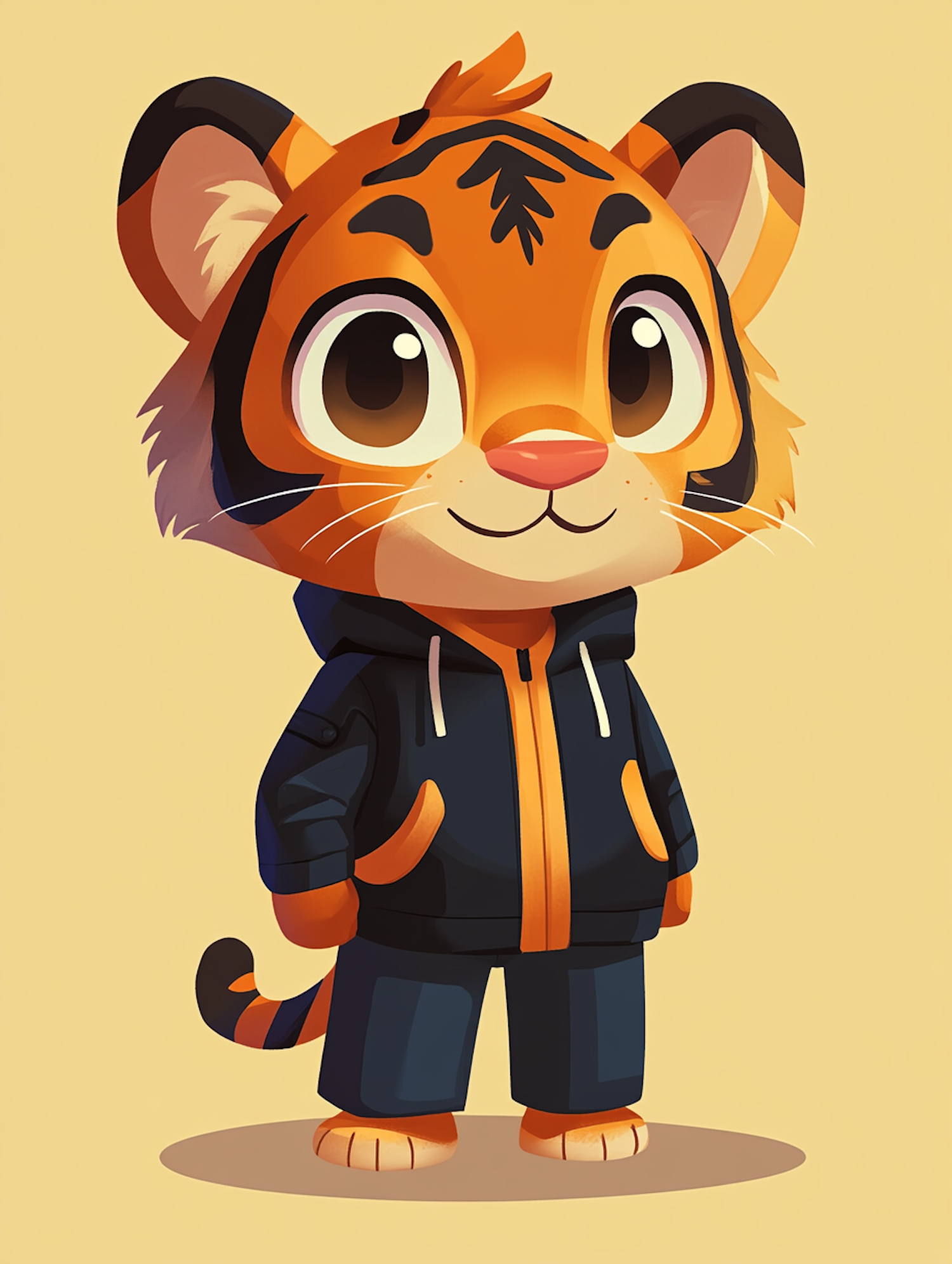 Adorable cartoon tiger in a black hoodie with orange accents, showcasing a playful and modern design against a plain background.