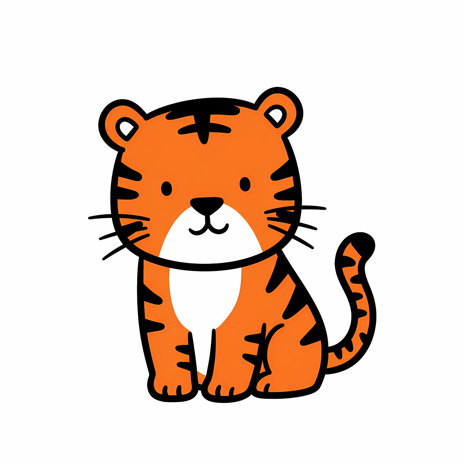 Adorable cartoon tiger with orange fur, black stripes, and a white belly, drawn in a simple and cheerful style on a white background.