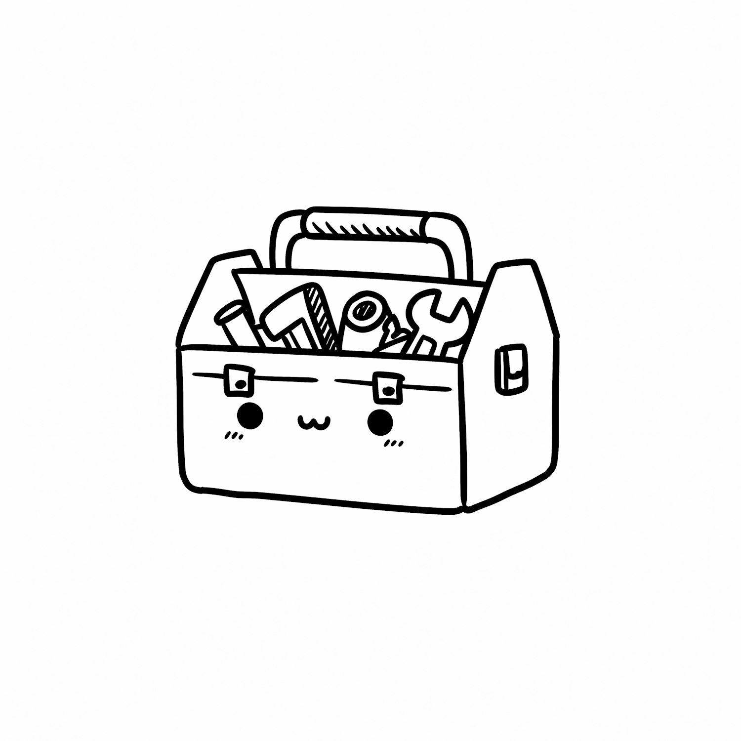 A cute black-and-white illustration of a toolbox with a cartoon face, containing tools like a wrench and screwdriver, on a plain background.