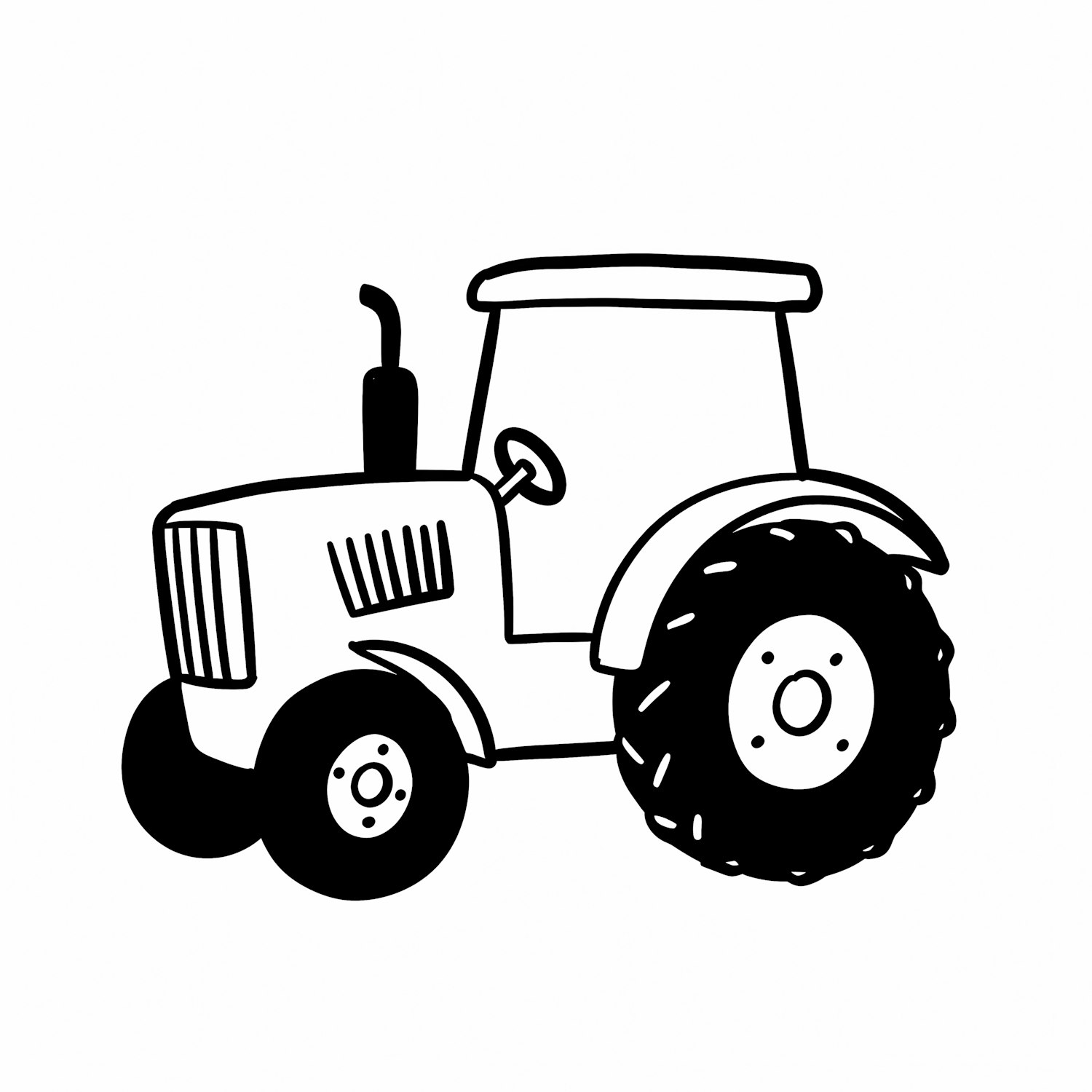 Black and white cartoon illustration of a tractor with bold outlines and simple design, featuring large rear wheels and a compact cabin.
