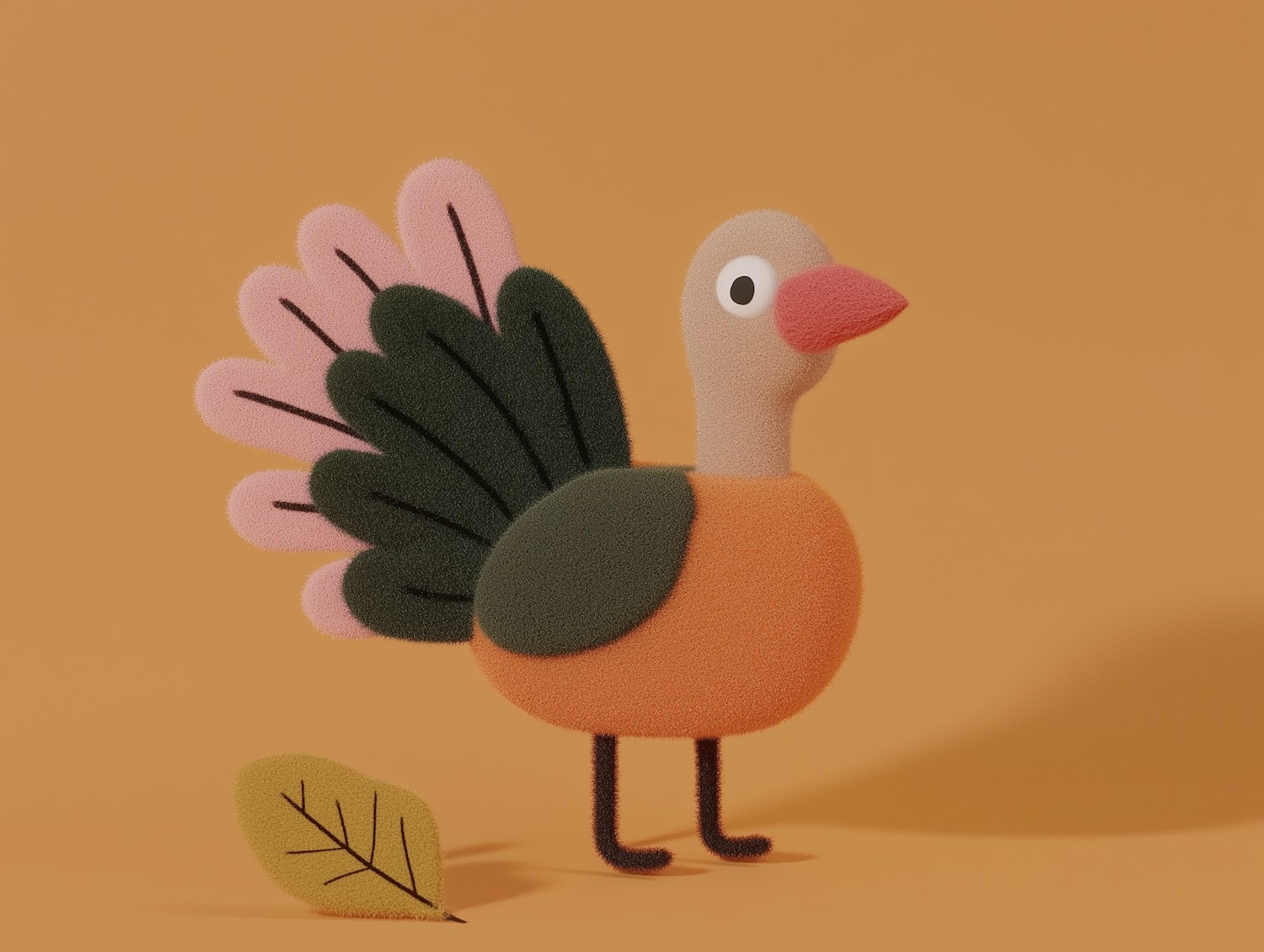 Cute 3D cartoon turkey with fuzzy texture, colorful feathers, and autumn leaf on warm orange background. Perfect for fall themes.