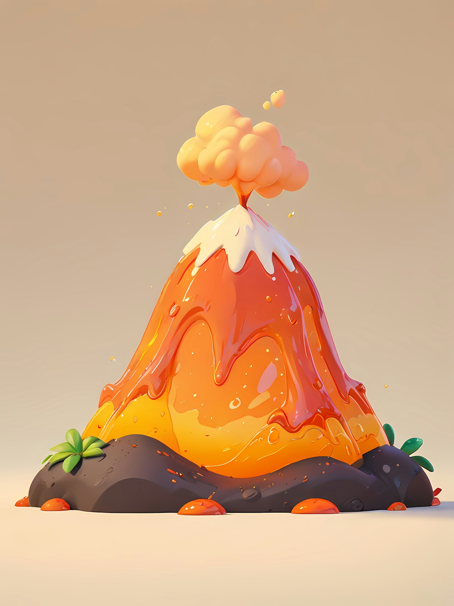 Whimsical 3D cartoon volcano with glossy lava, fluffy smoke, and vibrant details against a soft beige background.