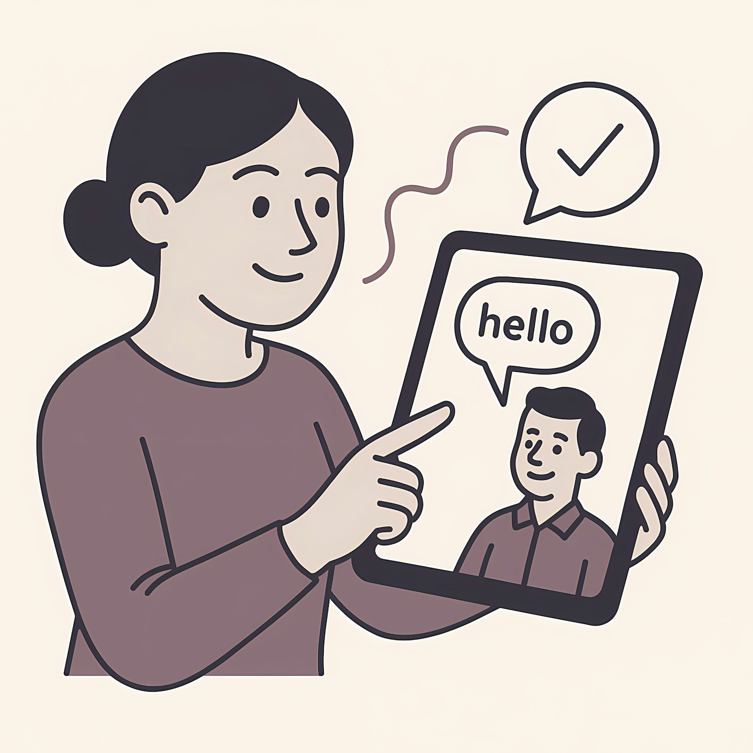 Cartoon of a woman using a tablet for video chat, with a man on the screen saying 'hello' and a checkmark indicating successful connection.