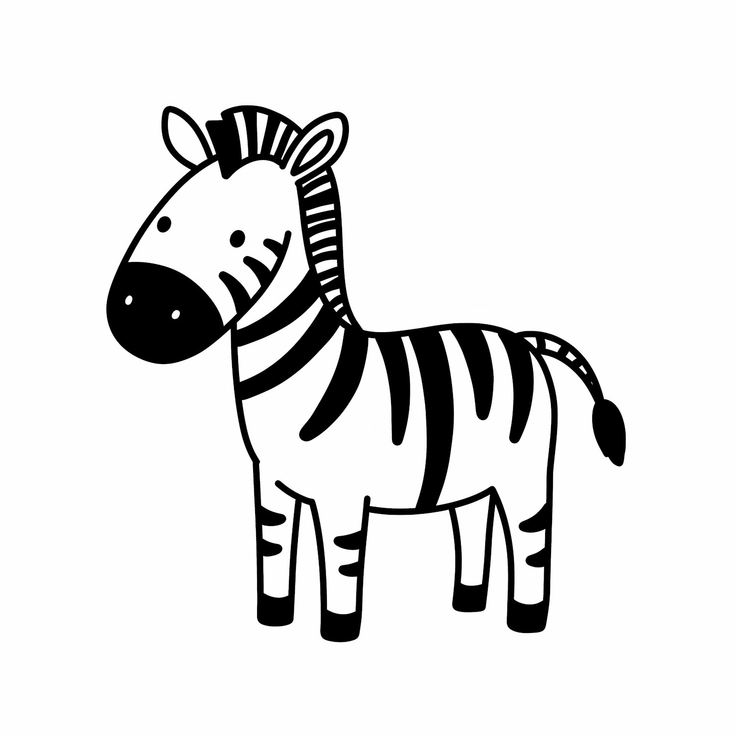 Cute cartoon zebra illustration with bold black and white stripes, perfect for kids' books or educational materials.