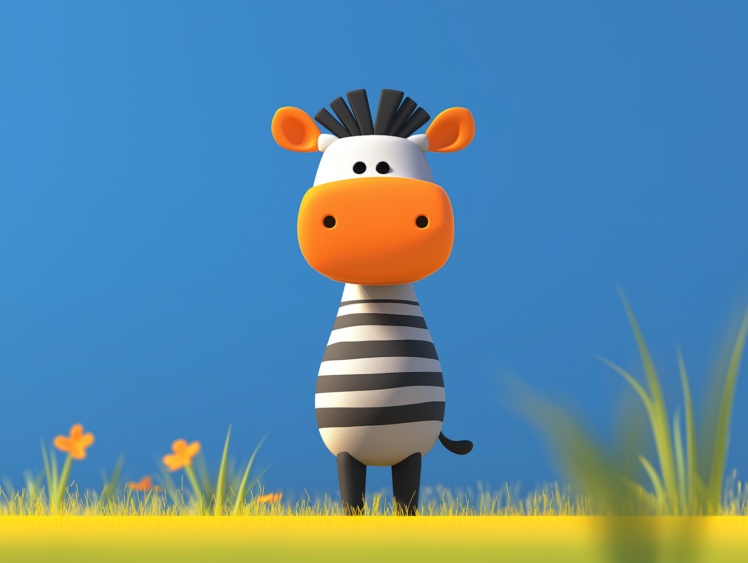 Adorable cartoon zebra with orange snout in a vibrant grassy field under a bright blue sky, surrounded by orange flowers.