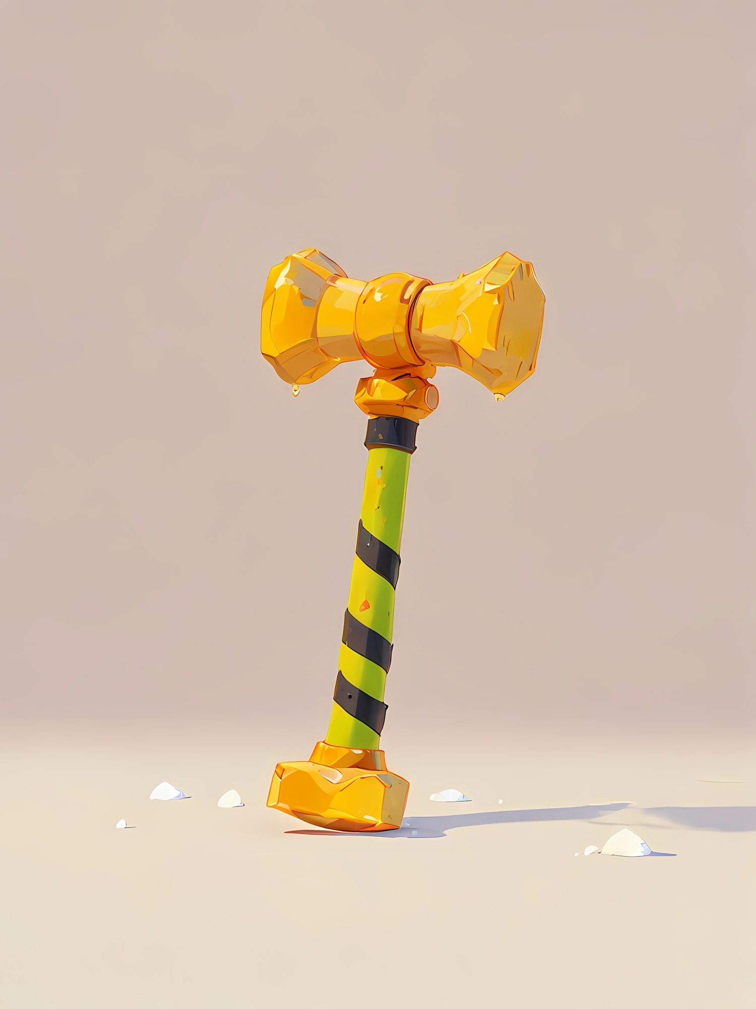 Bright yellow cartoon hammer with a striped handle, standing upright on a beige surface with scattered white debris around it.