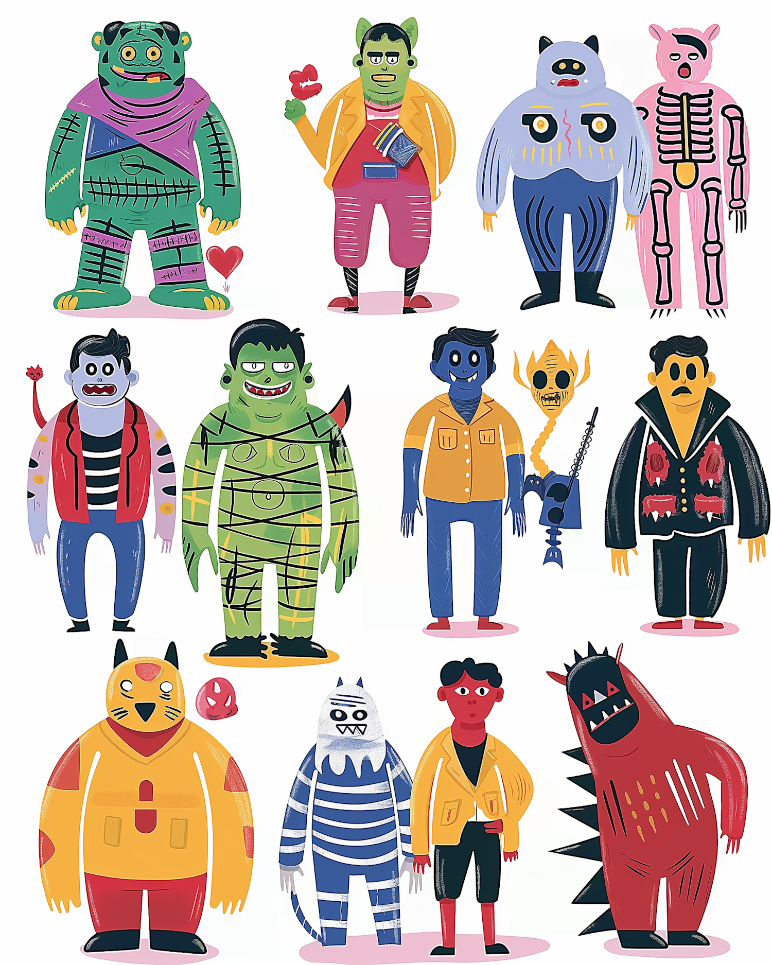 Colorful illustration of whimsical monsters with unique designs and vibrant colors, perfect for Halloween or fantasy themes.