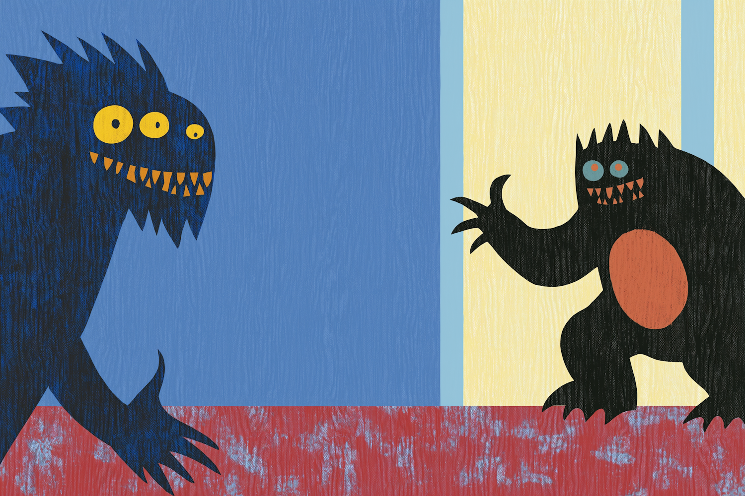 Two playful cartoon monsters face off in a colorful, whimsical setting with vibrant blue, yellow, and red hues.