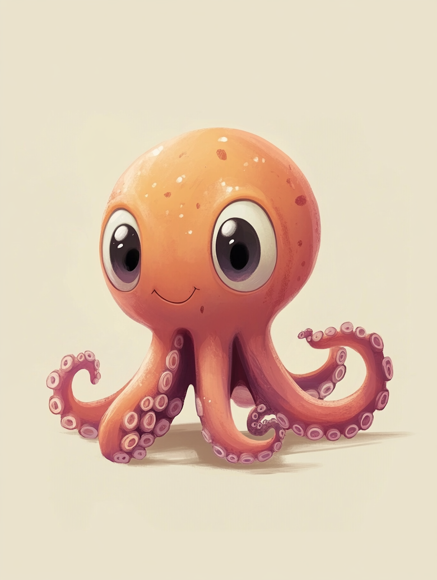 Adorable cartoon octopus with big eyes and a friendly smile, featuring curled tentacles and a vibrant orange color.