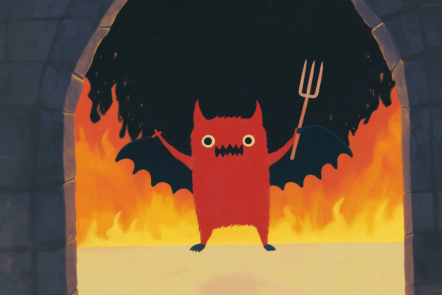 Cartoon red devil with pitchfork in fiery background, framed by stone archway. Whimsical and playful illustration.