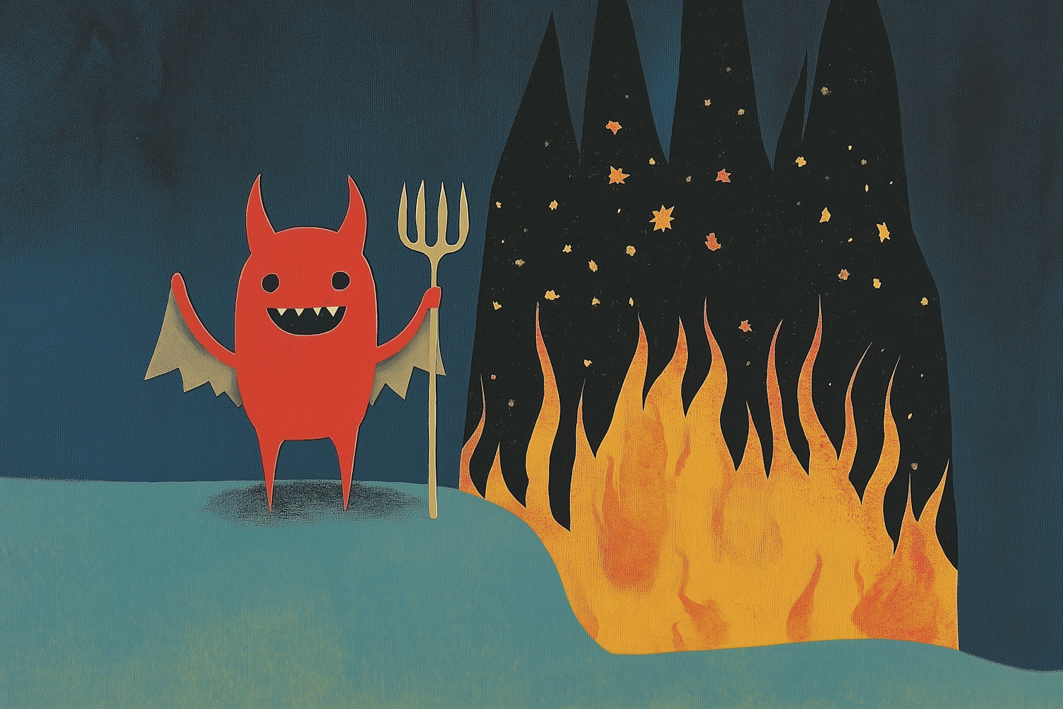 Whimsical cartoon devil with a trident stands before stylized flames, set against a dark blue background. Playful and mischievous illustration.