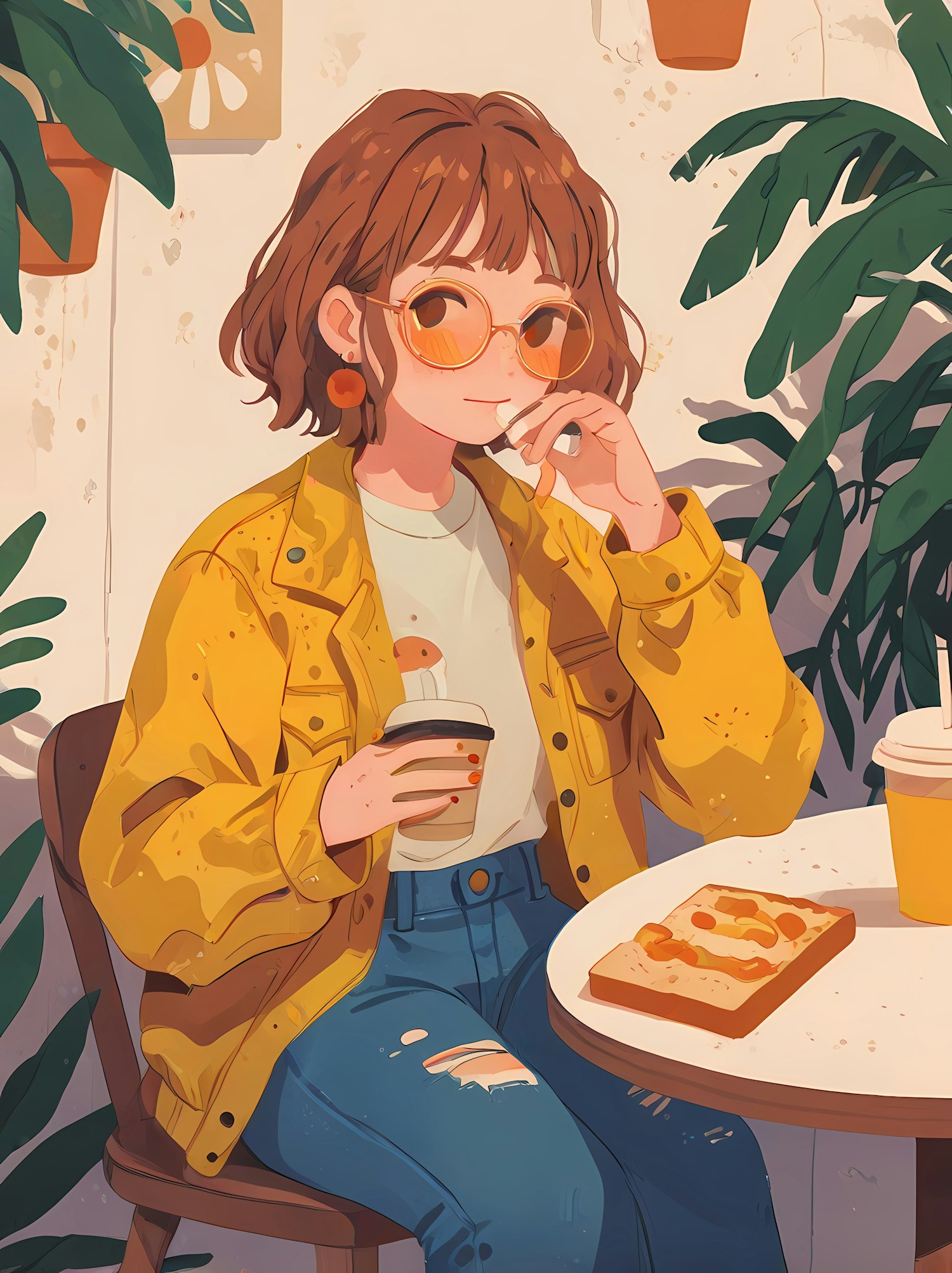 Charming illustration of a woman in a yellow jacket enjoying coffee at a café, surrounded by plants and warm tones.