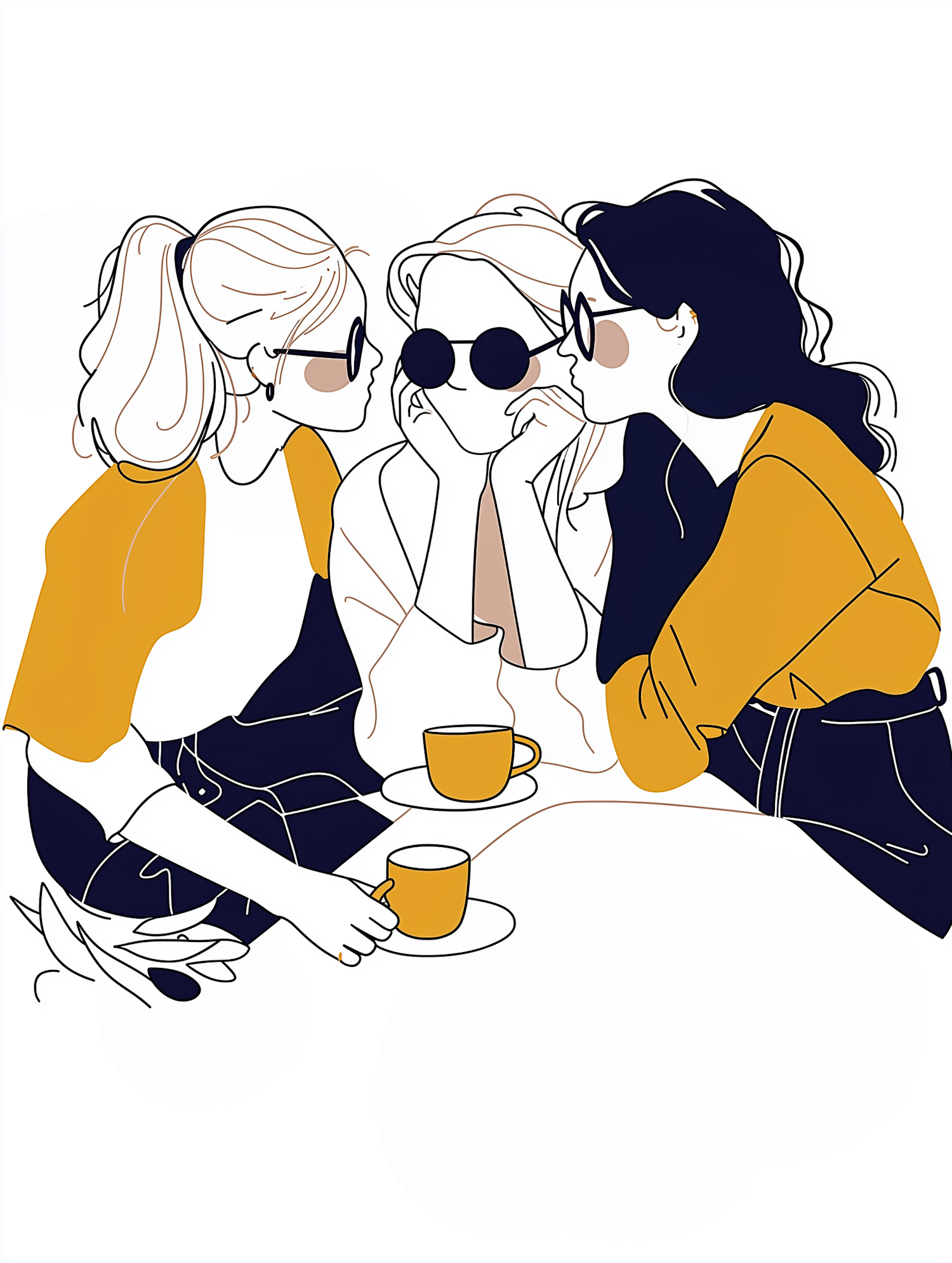 Minimalist illustration of three women with sunglasses, sharing a moment over coffee. Stylish and modern design with mustard accents.