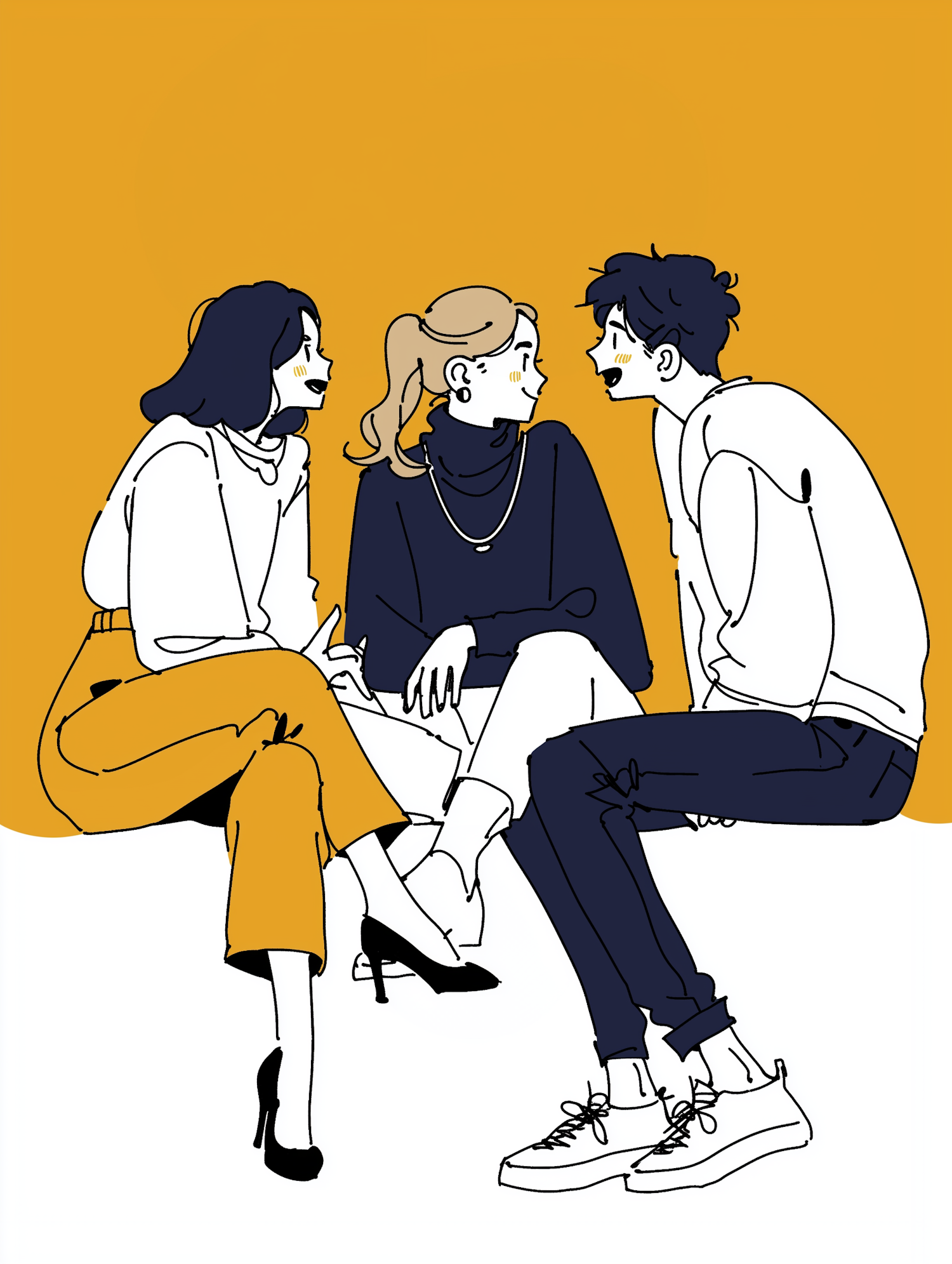 Three animated characters in a lively conversation, set against a mustard yellow background. Stylish outfits and dynamic poses.
