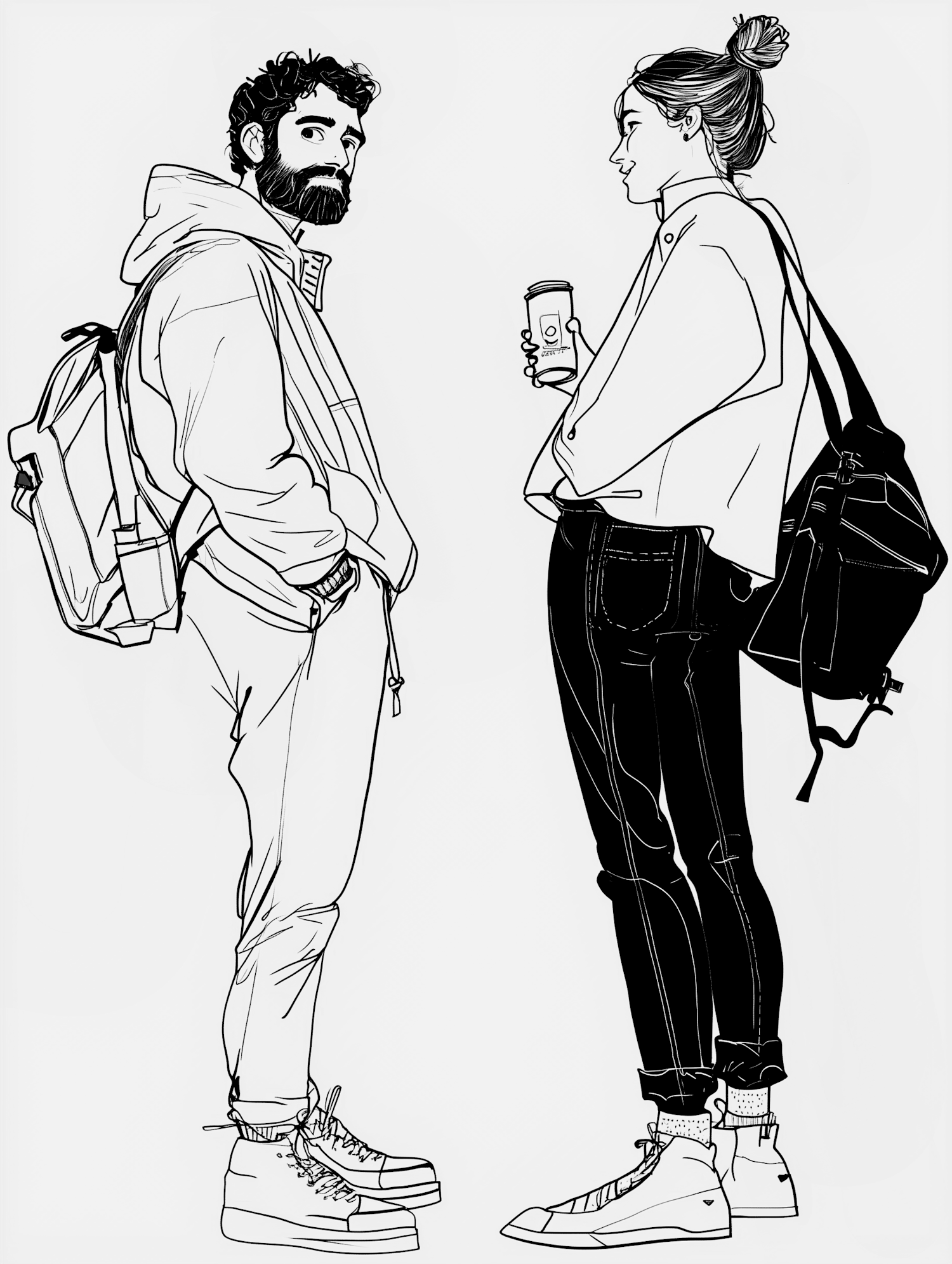 Stylish black and white illustration of a bearded man and a woman with a bun, both in casual attire, engaging in a casual encounter.