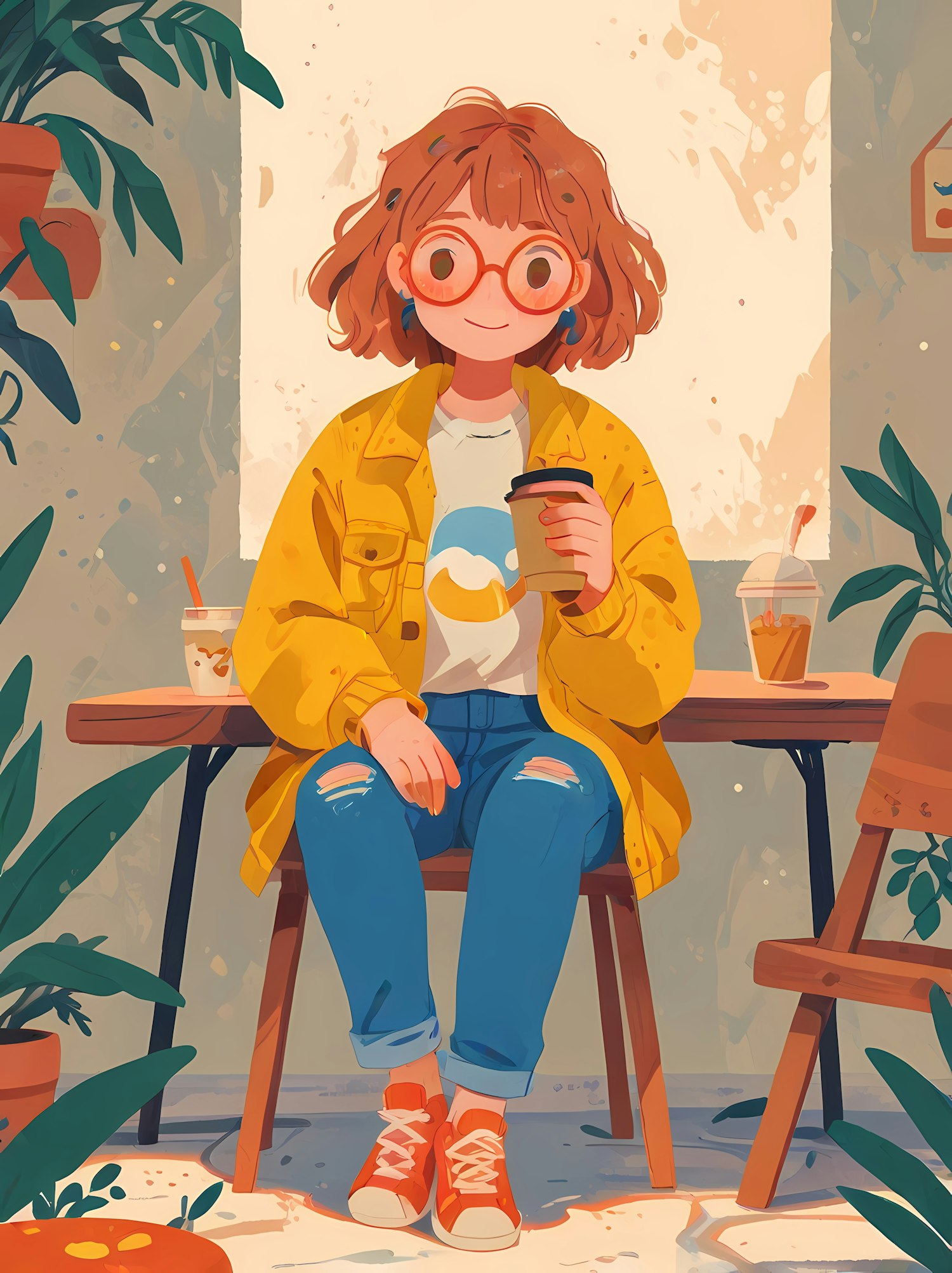 Illustration of a young woman in a yellow jacket and glasses, enjoying coffee in a cozy cafe with plants and a warm ambiance.