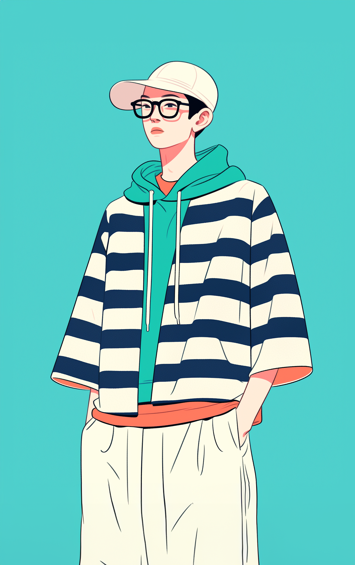 Stylish illustration of a young man in a striped shirt and teal hoodie, wearing glasses and a cap against a teal background.