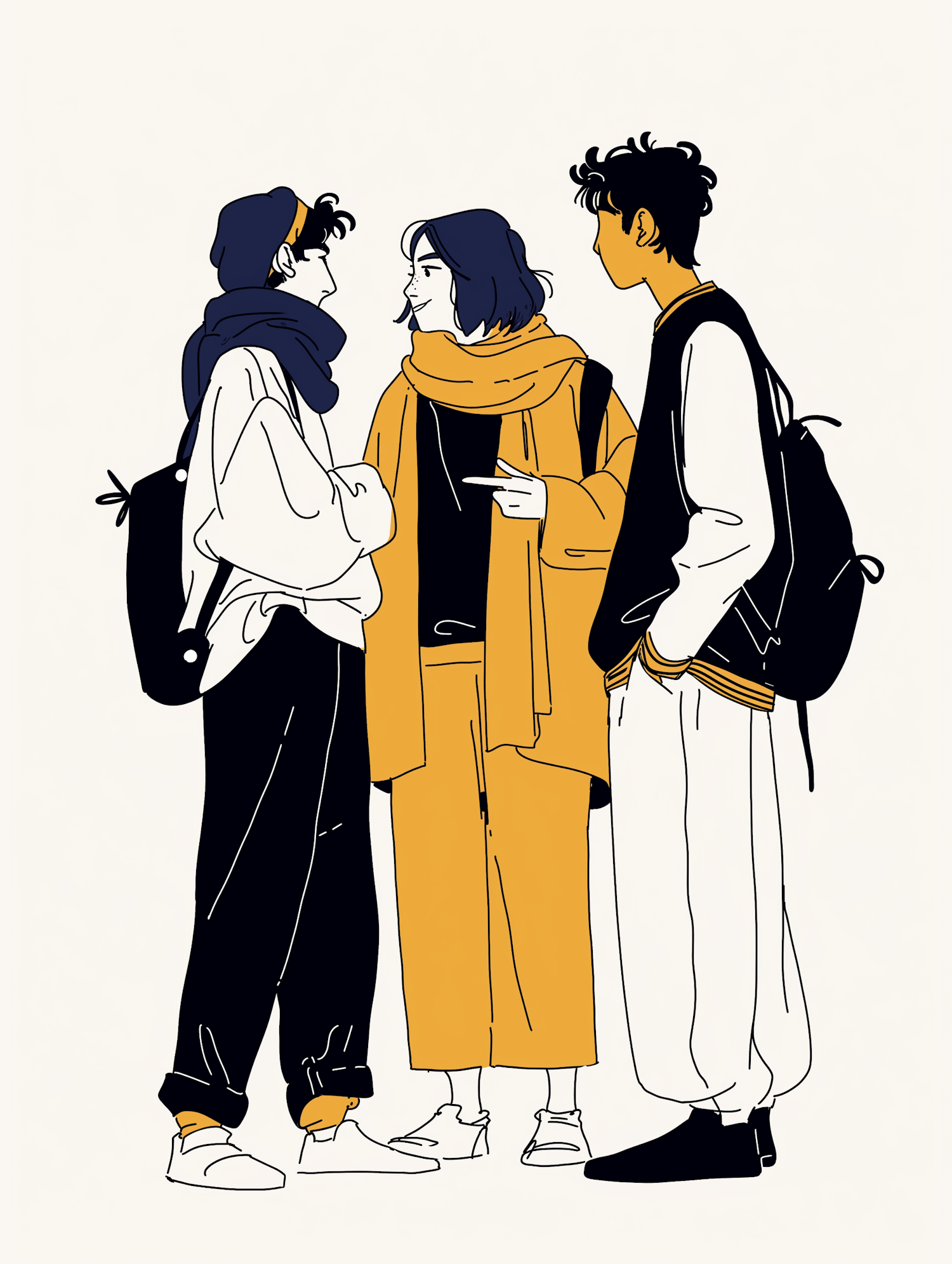 Stylish illustration of three young people in conversation, featuring a minimalist color palette of mustard, black, and white.
