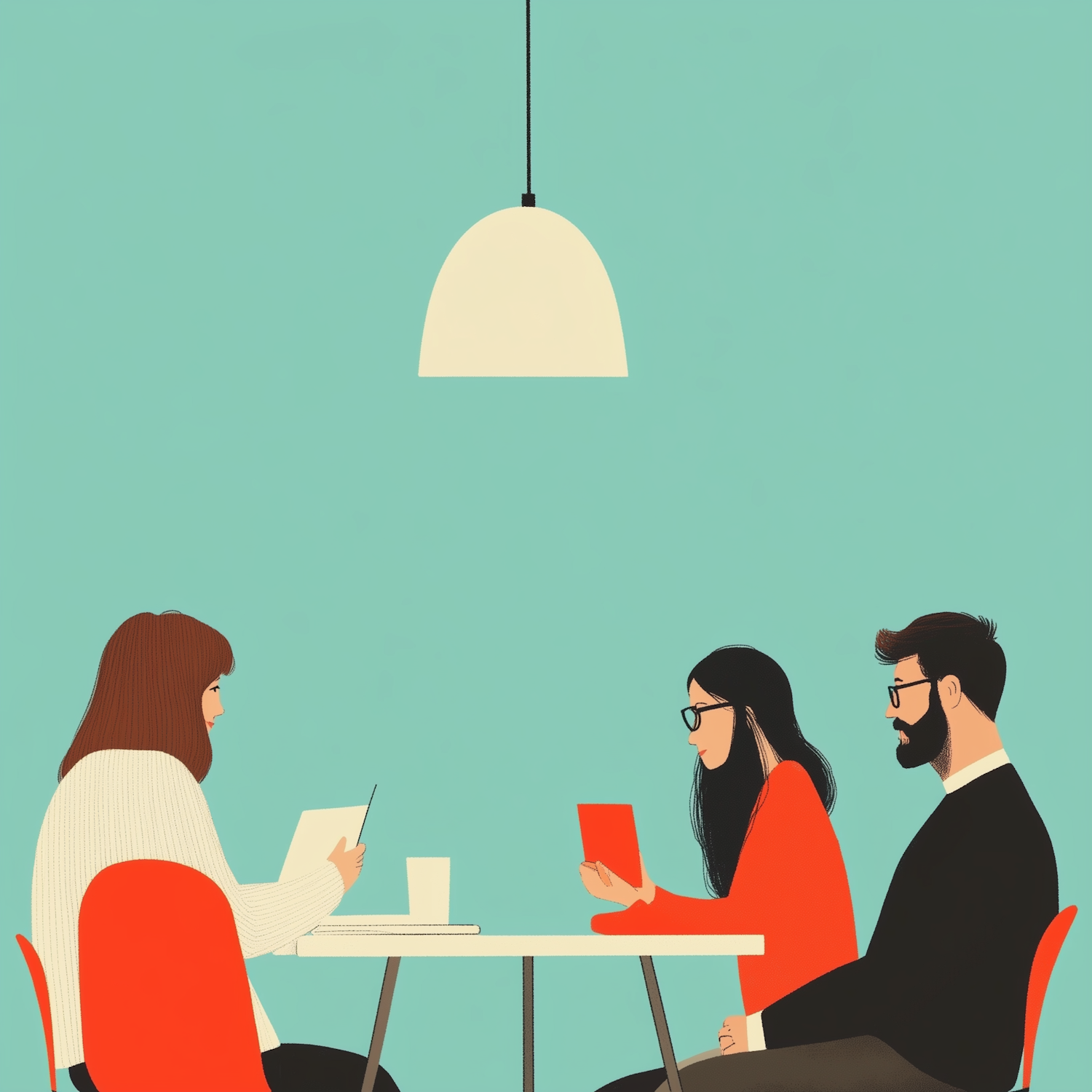 Minimalist illustration of three people reading at a table with a teal background and a pendant light.